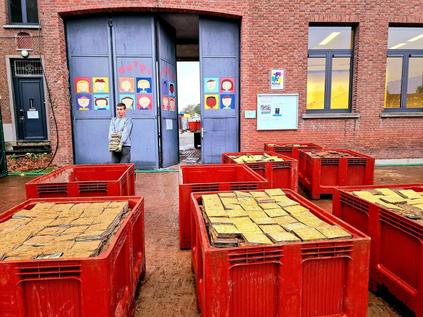 Voor materialen afkomstig uit de noodzakelijke sloop die ze niet ter plekke een tweede leven konden geven, werkten de architecten samen met verdelers van recuperatiematerialen, zoals Rotor DC. Er werd info uitgewisseld met een architectenbureau dat interesse had in het recupereren van het aluminium schrijnwerk en leraars en omwonenden profiteerden van de demontageperiode om zelf zaken te recupereren.