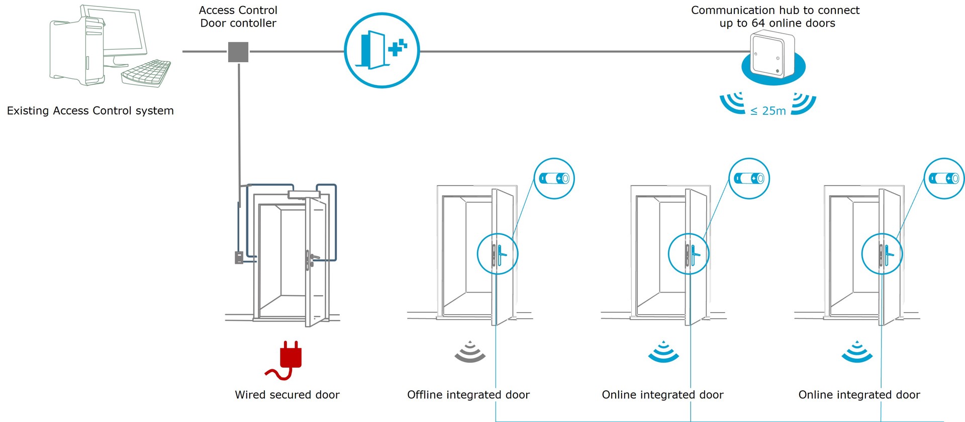 Online integratie biedt real-time monitoring en de mogelijkheid om deuren vanop afstand te vergrendelen of ontgrendelen. Bij offline toepassingen worden toegangsrechten via badges geüpdatet. Beide methodes zijn combineerbaar binnen hetzelfde systeem.
