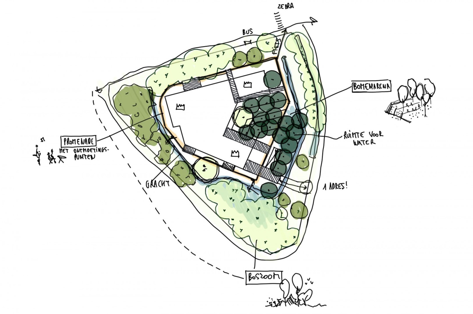De inplanting van het gebouw en de buitenaanleg eromheen houdt rekening met een maximaal behoud van de aanwezige bomenclusters op de site, de te respecteren bouwvrije zones langs de omliggende verkeersinfrastructuur, en een minimale ruimtelijke impact op de aanpalende woonwijk.