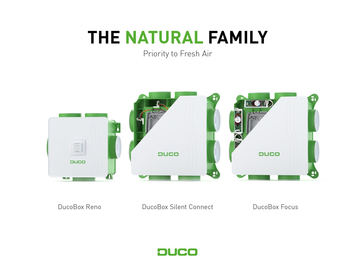 DUCO introduceert een nieuw samengestelde familie van mechanische ventilatie-oplossingen (Systeem C) onder de naam The Natural Family. Deze familie vormt een perfecte aanvulling op The Energy Family, die bekendstaat om haar aanbod van mechanische ventilatie-units met warmterecuperatie (systeem D). Samen maken ze van DUCO een totaalaanbieder van ventilatiesystemen, met oplossingen voor elke situatie.