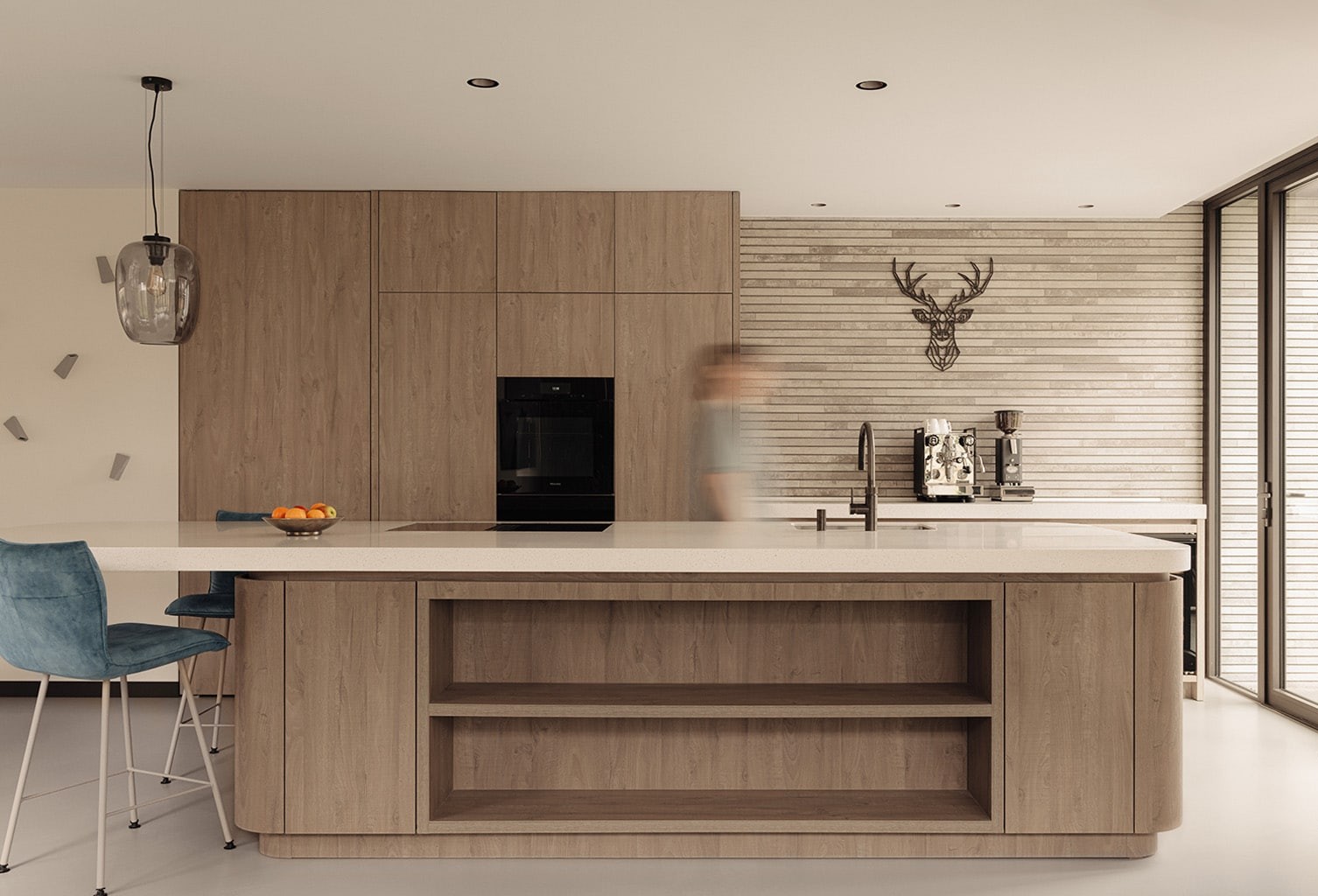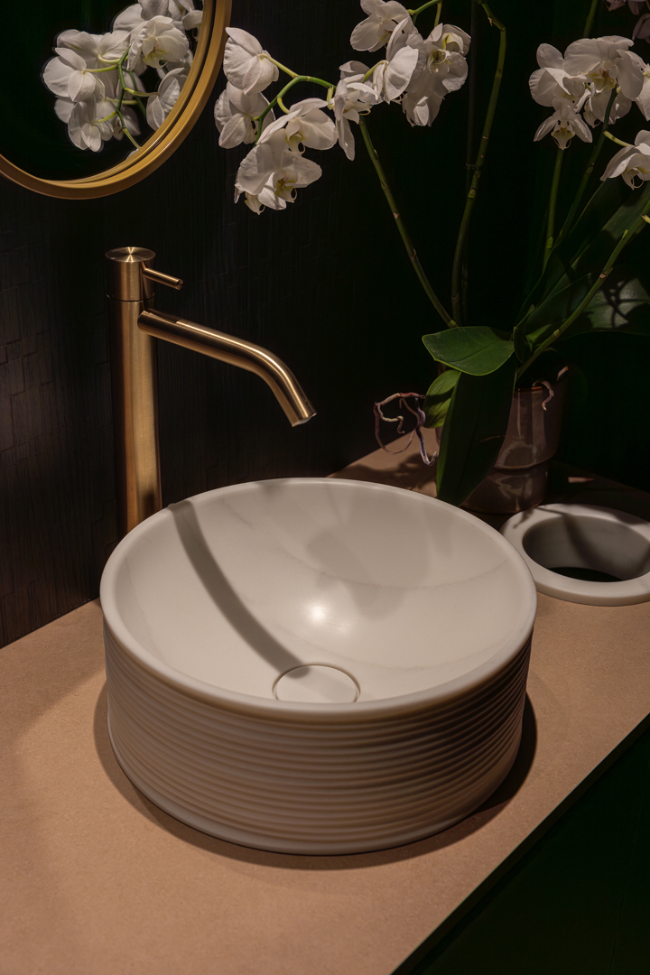 Binnen de collectie biedt DecoLegno ook Patternine aan: een techniek waarbij driedimensionale structuren in Durasein solid surface worden gefreesd. De patronen variëren van vloeiende, organische reliëfs tot strakke geometrische composities. In combinatie met licht ontstaan zo tactiele en visueel gelaagde oppervlakken die een interieur een uitgesproken identiteit geven.