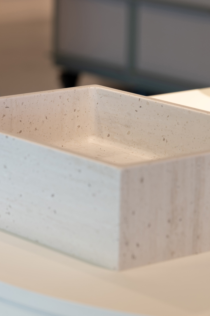 Het assortiment omvat ook Durasein solid surface waskommen, die design combineren met functionele hygiëne. Ze zijn glad, antibacterieel en eenvoudig schoon te maken. Elk model is verkrijgbaar in verschillende decors en kan op maat worden geconfigureerd, met opties voor montage, overloop en afwerking.