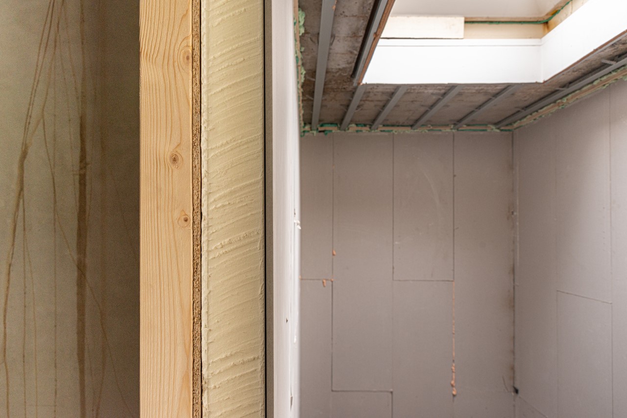 Om de energiekosten flink terug te brengen, besloot de nieuwe eigenaar de renovatie van de bungalow te combineren met een ingrijpende verduurzaming. Niet alleen het enorme platte dak maar ook de muren moesten daarom worden geïsoleerd. “Bij de keuze van het isolatiemateriaal hebben we ons laten adviseren door Bouwcenter RAB Amsterdam, het bedrijf dat onze bouwmaterialen levert”, blikt Bavinck terug. “Om in aanmerking te komen voor subsidies, moest het isolatiemateriaal een bepaalde minimale Rd-waarde hebben.” Bovendien waren volgens hem twee verschillende soorten isolatieplaten nodig. “Eén om op de begane grond van binnenuit te isoleren en één om op de eerste verdieping van buitenaf te isoleren. Dat laatste was nodig om binnen geen woonruimte te verliezen.”