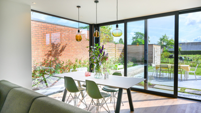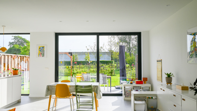 Door samen te bouwen, konden de zussen verschillende kosten delen – architect, werfkraan, materiaaltransport, infrastructuurwerken … “Maar samenwonen op één perceel loont niet alleen financieel, we wonen vandaag ook echt gelukkiger”, aldus Jasmien. “Hoewel we elke een eigen woning hebben, leven we toch in verbondenheid. De gezamenlijke tuin, met zwemvijver, moestuin, serre, en pizzaoven, vormt daarbij het kloppende hart. De kinderen spelen er dagelijks samen.