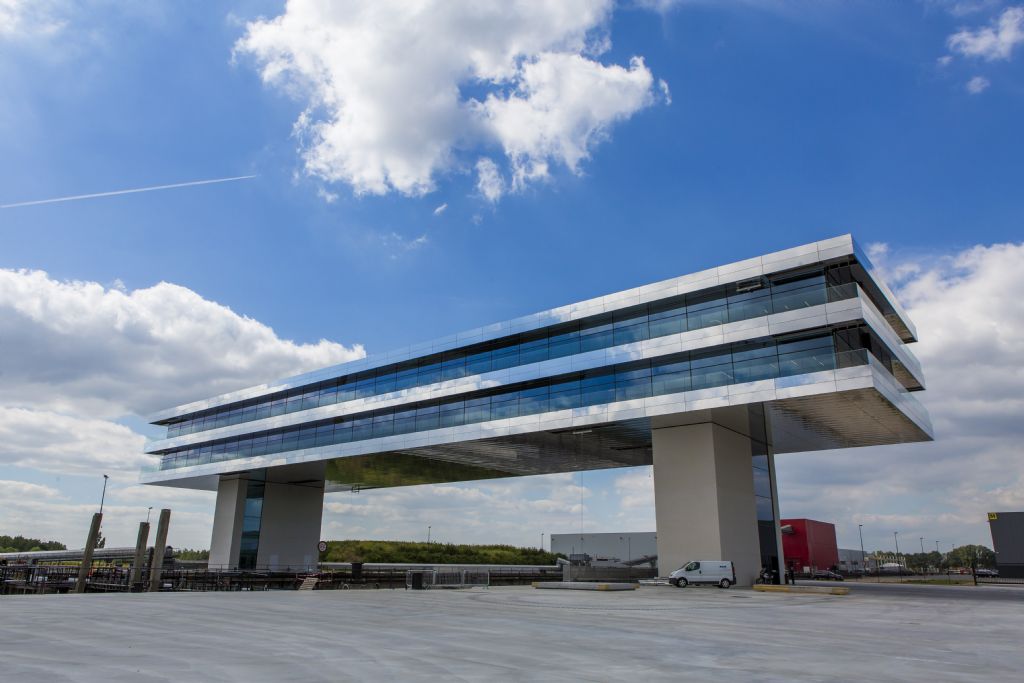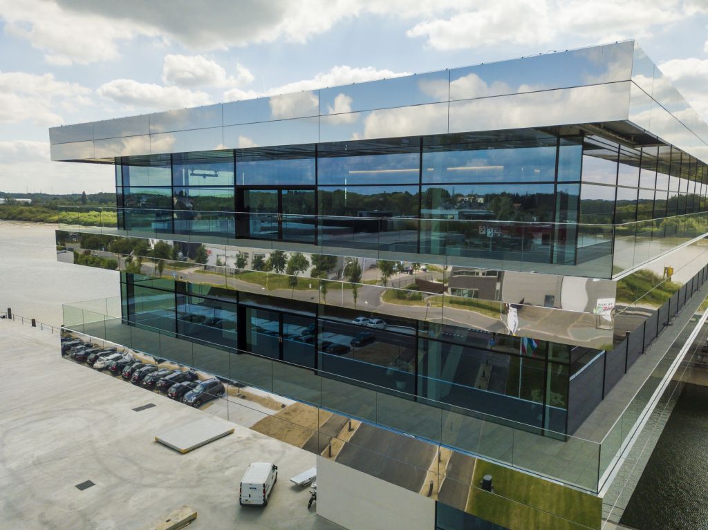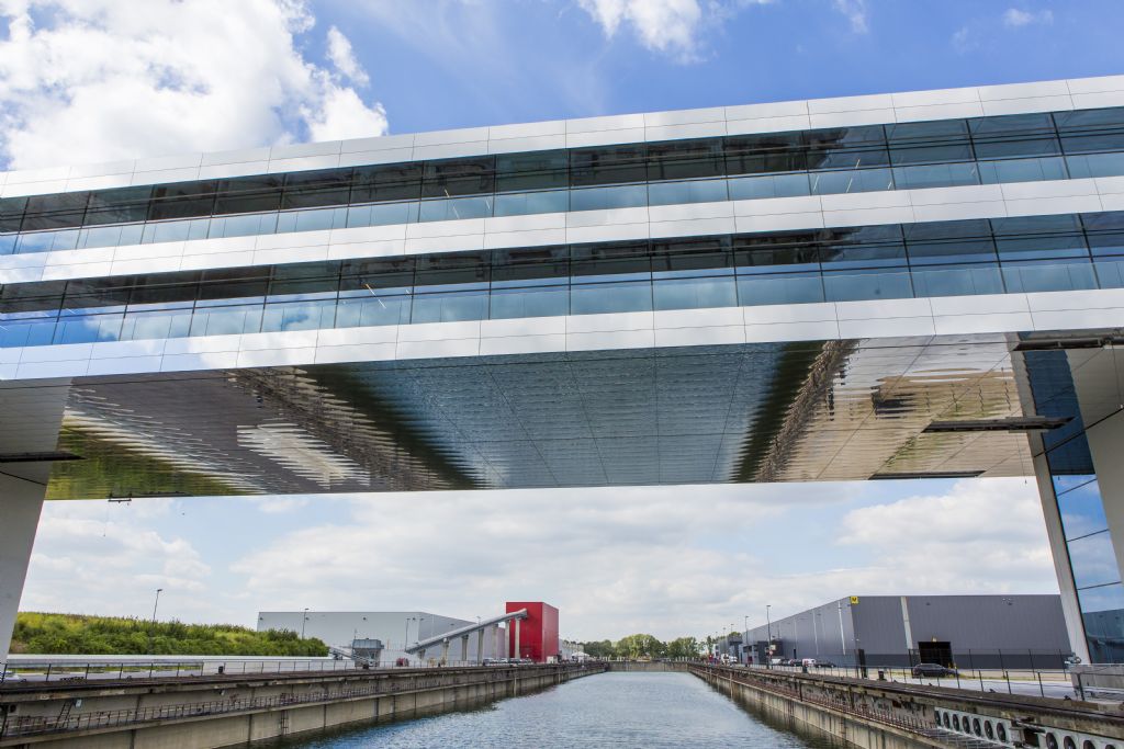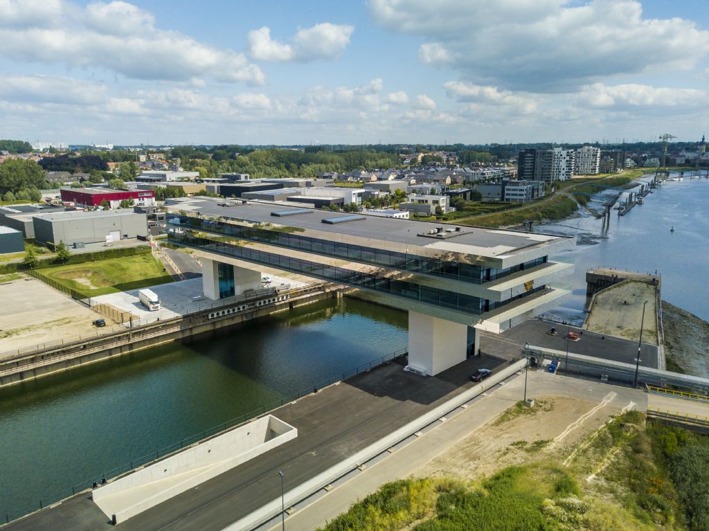 Het heeft de vorm van een brug en steunt op de beide oevers van het droogdok, dat met een lengte van 560 meter en een breedte van 55 meter het grootste ter wereld is. Er konden tegelijk twee grote schepen gebouwd worden. "Na het faillissement van de scheepswerf werd de activiteit van het droogdok stilgelegd, maar door onze zetel 20 meter boven het waterpeil te bouwen, houden we alle opties open voor een mogelijke herbestemming of hergebruik van het dok in de toekomst", stelt projectverantwoordelijke Gert Hoefnagels.