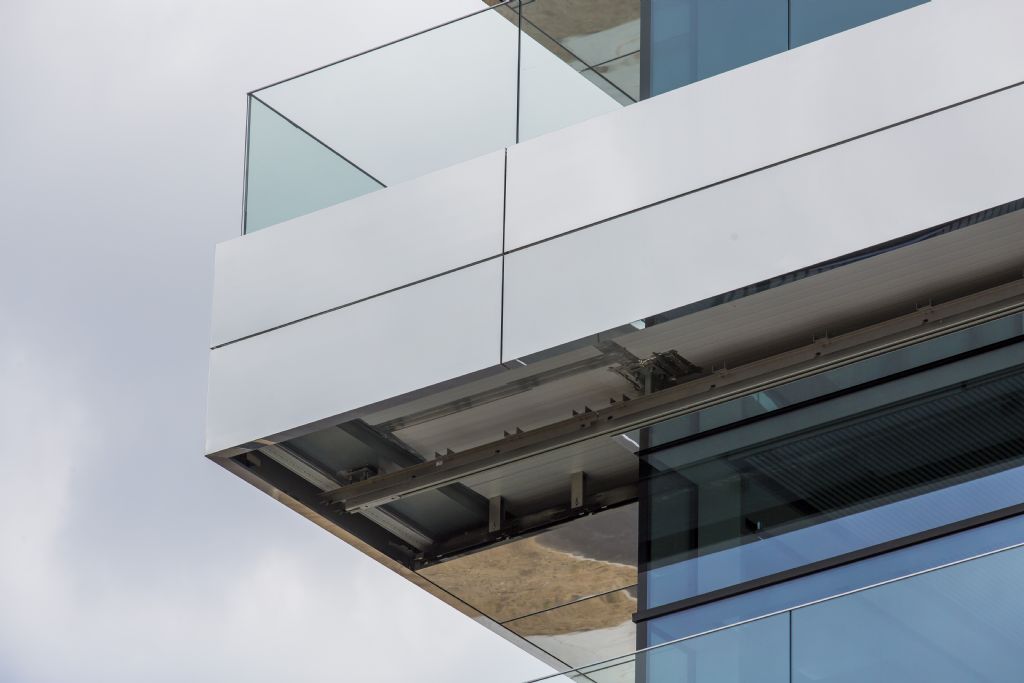 De terrassen aan de twee uiteinden van de kantoren zijn bereikbaar via schuifdeuren van het type Schüco ASS 70.HI. De verticale glasstroken van de toegangspilaren werden vervaardigd met behulp van het systeem Schüco AOC 60 ST.SI (= Add On Construction Steel). De horizontale aluminium profielen zijn hier bevestigd op een interne stalen substructuur, die de krachten opneemt van het gewicht en de winddruk/-onderdruk die veroorzaakt wordt door de grote glasoppervlakken uit één geheel.
