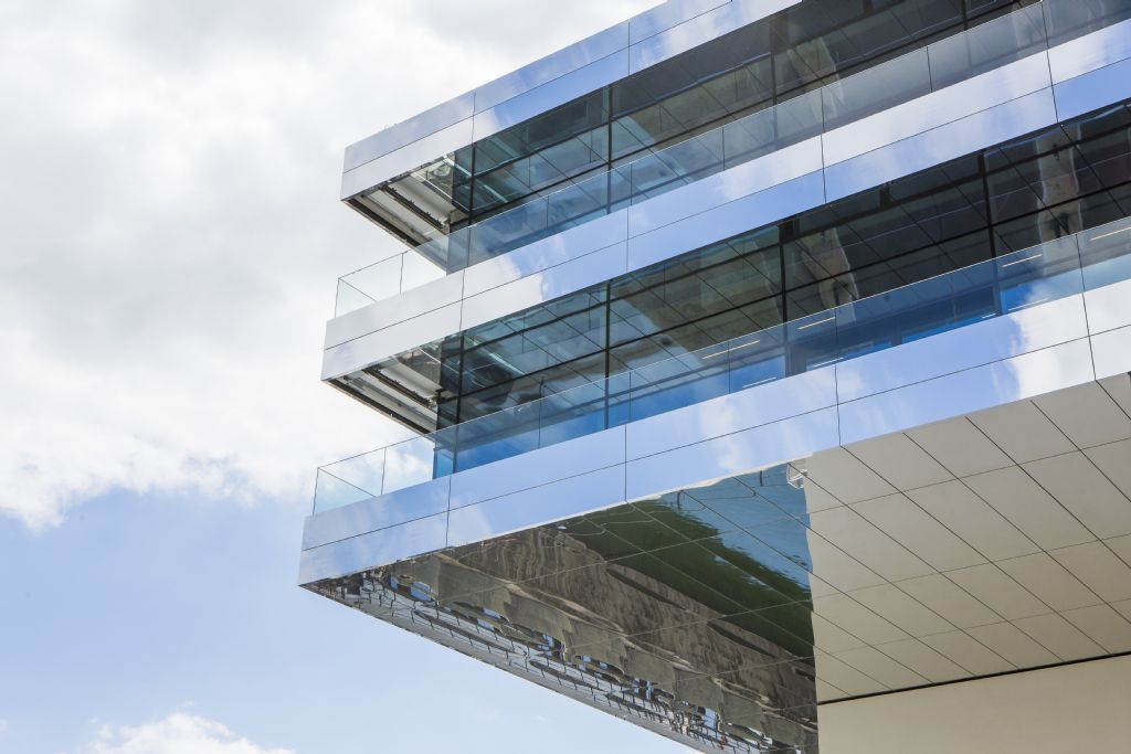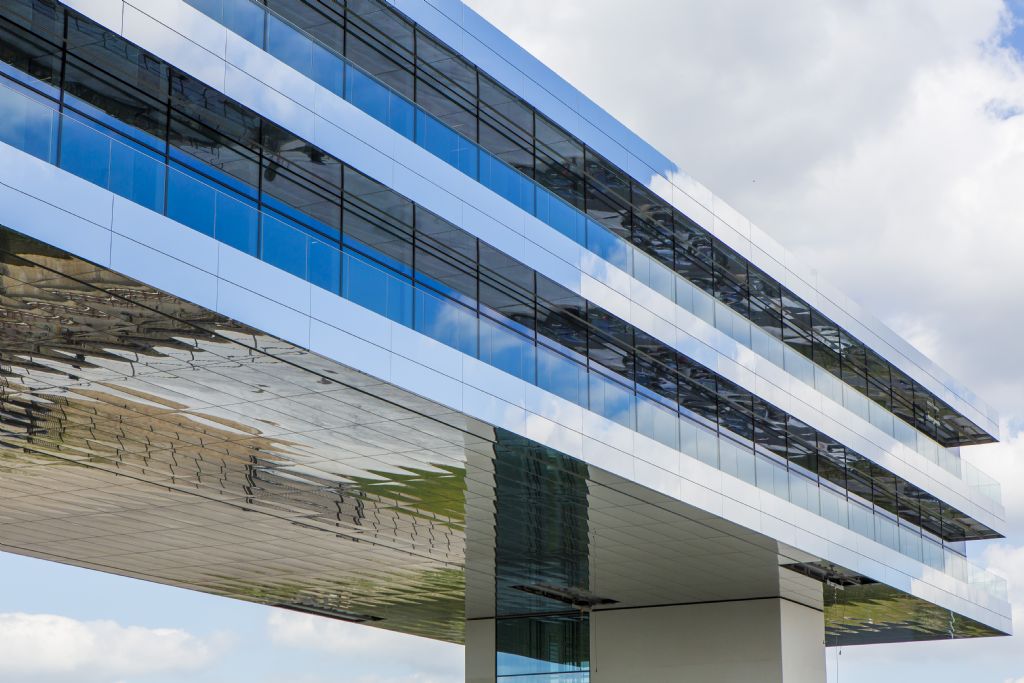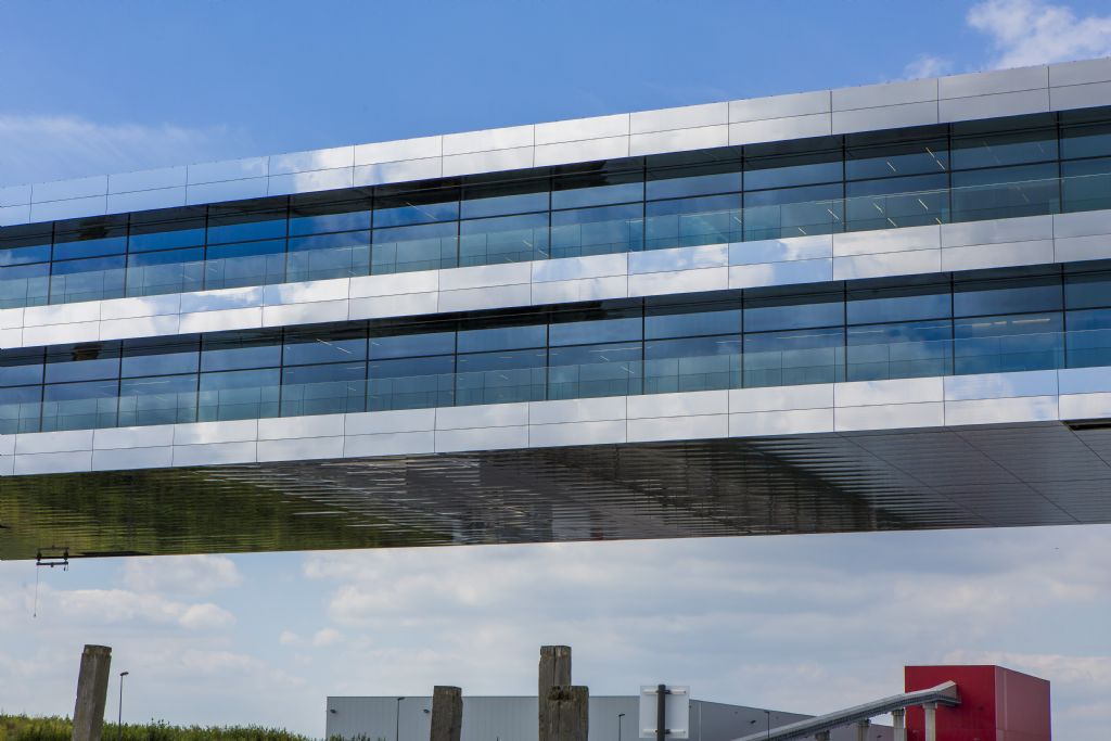 Alle externe raamsystemen werden gekozen wegens hun grote weerstand tegen hoge belastingen (gewicht van de beglazing en windbelasting), maar ook wegens hun hoog isolatieniveau, compatibel met een passief gebouw. De gevels van de kantoren zijn voorzien van driedubbele beglazing, die gedragen wordt door een vliesgevelstructuur van het type Schüco FWS 60.SI. De kantoorgevels zijn bekleed met Schüco vliesgevels. Naast de grote afmetingen van de glaspartijen was de voornaamste moeilijkheid van de bouwwerf de grote flexibiliteit van het metalen geraamte. Er moest dus een oplossing gevonden worden opdat de gevels zich zouden kunnen aanpassen aan de bewegingen van de vrije overspanning van 72 meter.