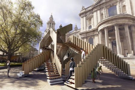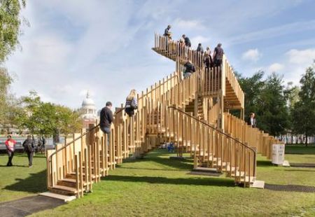 Endless Stair is een opvallend project. Je vindt deze 15 op elkaar aansluitende trappen, gemaakt van Amerikaans, dwars gelaagd tulpenhout en geïnspireerd door 'het trappenhuis' van M.C. Escher, op het grasveld voor het wereldberoemde Tate Modern museum. De constructie maakt deel uit van het London Design Festival 2013, één van Europa's belangrijkste, jaarlijkse design events. De installatie werd ontworpen door de Rijke Marsh Morgan Architects (dRMM) en gebouwd door Arup. Het is tegelijkertijd een kunstwerk en een onderzoek naar houttechnologie en duurzaamheid.