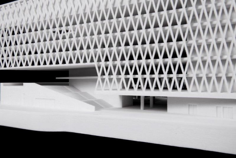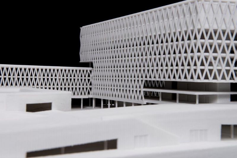 Tijdens de eerste testfases waren de volumes achter de rasterstructuur gesloten. Het transparante effect van de gevel ging daardoor helaas verloren. “Op aanvraag van de architecten hebben we de maquette uiteindelijk helemaal open gerealiseerd,” vertelt Geerten Vester. Dat vroeg een andere aanpak dan een gesloten maquette. “Stabiliteit was ons grootste bekommernis. In het streven naar transparantie hebben we getracht zoveel mogelijk binnenmuren te verwijderen. De gevelstructuur draagt letterlijk het hele gebouw waardoor we quasi als ingenieurs aan de slag moesten. Enkel de meest noodzakelijke binnenmuren zijn geprint, de rest hebben we weggelaten.”