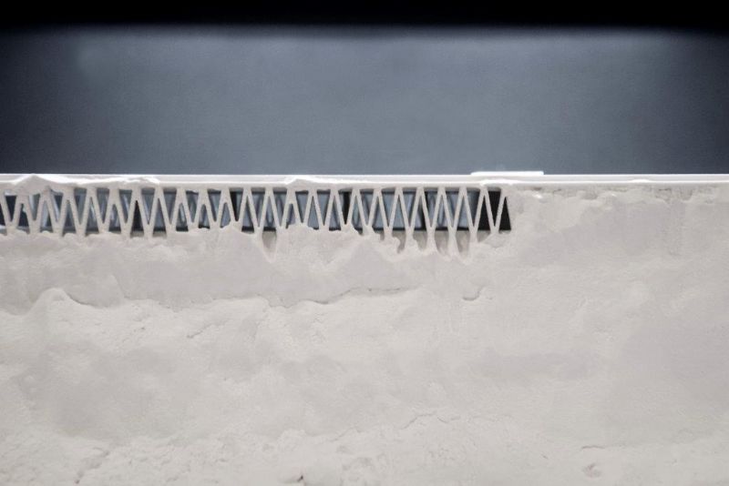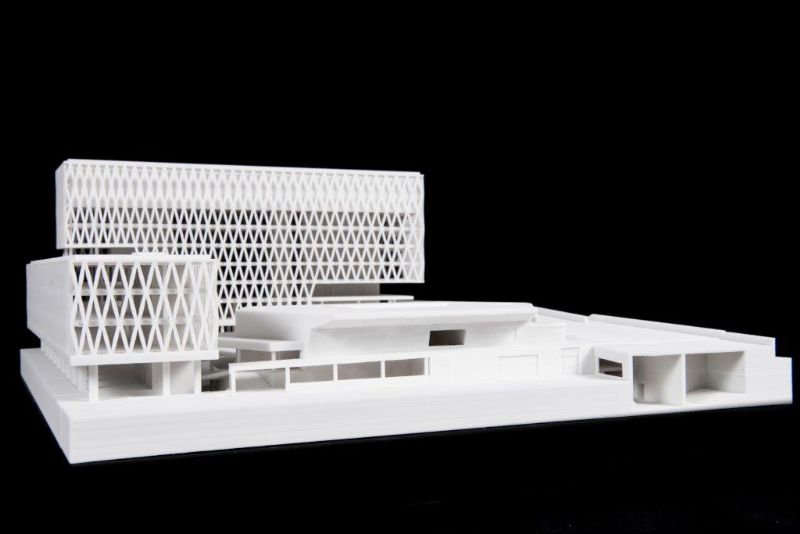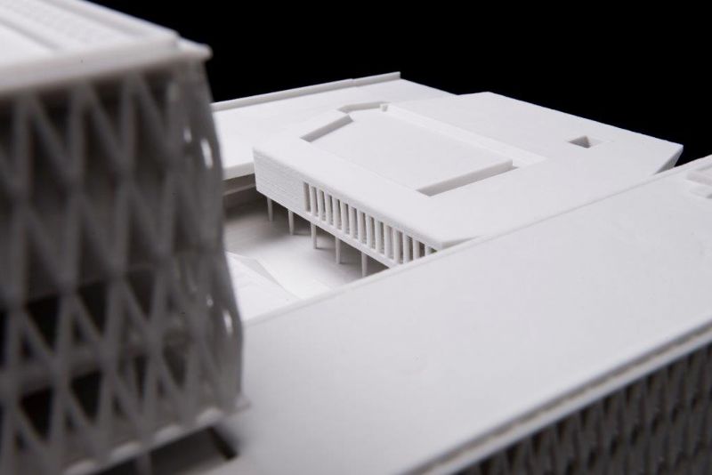 De maquette etaleert een opmerkelijke detailleringsgraad, getuige daarvan de fijne gevelstructuur met amplitude. Maar bij het aanschouwen van het model roemen de architecten ook de esthetiek van de 3D-print. “De textuur is ruw en dat is positief,’ vindt Patrick Lootens. “Door die tactiliteit wil je het model gewoonweg aanraken. En dat is de meerwaarde van dergelijk model: een maquette die zonder zorgen van hand tot hand kan gaan.” De ruwheid van het model brengt een mat effect met zich mee, tot grote tevredenheid van POLO Architects. “De ruwe oppervlaktes sluiten weerkaatsing van het licht en glans uit..”