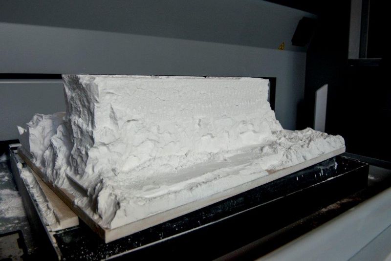 Goedhart Repro ging in eerste instantie aan de slag met een .stl-bestand. Daarover modelleerde het bedrijf een 3D printbaar model. “Door verschaling worden bepaalde elementen te klein om te printen. In ons ontwerp dikken we die elementen dan aan zodat de printer ze kan realiseren,” aldus Geerten Vester. De printer legt vervolgens lagen plaasterpoeder op elkaar. De printkoppen brengen een bindende stof op het poeder aan op de contouren van het model. Daarna blazen ze bij Goedhart Repro het poeder weg. “Eerst hebben we een beetje poeder verwijderd zodat de gevelstructuur bloot kwam te liggen. Die hebben we eerst gelijmd zodat de schil stevig werd. Daarna hebben we het poeder tussen de verdiepingen weggeblazen en de rest van de maquette gelijmd.”