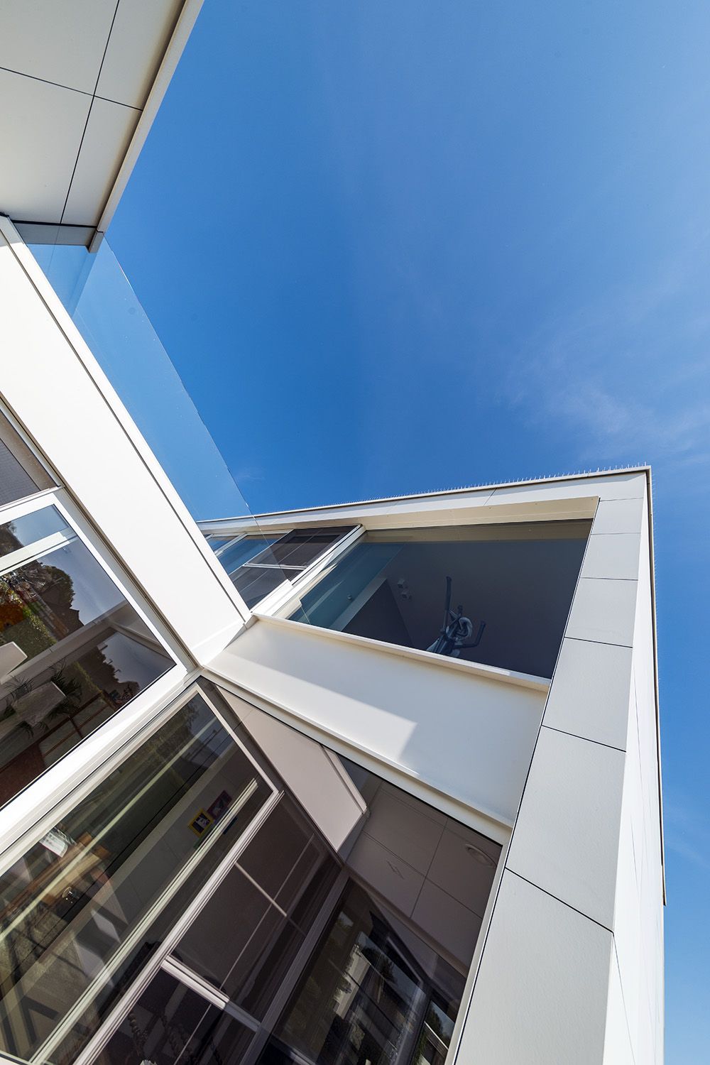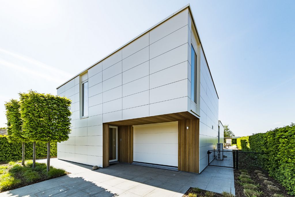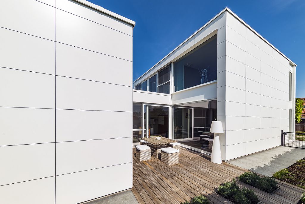 Voor zijn woning gebruikte Wim Smekens 250 m² aan Rockpanel-gevelbekleding, geleverd door BMB bouwmaterialen en verlijmd toegepast. Door te kiezen voor de kleur RAL 9010, gelijk aan de raamkozijnen van zijn moderne woning, is het huis nu een prachtig fris geheel, waar Wim Smekens nog altijd erg blij mee is. “Wij vinden het resultaat prachtig. De details vinden we ook zeer geslaagd. Zo hebben we de kopse kanten van de platen overal bijgekleurd en hebben we aandacht besteed aan de afwerking rond alle ramen, waar de voegen zoals in de gevel ook weer terugkomen. Alle voegen zijn gelijk, en er is ook steeds gelet op andere details, tot aan de kleur van de verluchtingsroosters toe. Het was natuurlijk gedurfd om de volledige woning te bekleden met gevelpanelen, maar we vinden het gehele project zeer geslaagd.”