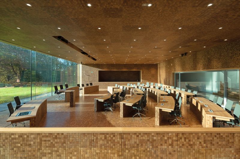 Wat betreft het interieur wilde men vooral de verschillende ruimtes in elkaar laten overvloeien. Samen met de grote nieuwe trap kreeg de centrale hal of foyer dan ook een bemiddelende functie tussen oud en nieuw. Hij is strak en symmetrisch en verbindt de plenaire zaal en de trap met elkaar door middel van grote openingen in de wand. De wanden van de foyer zijn wit gepleisterd, terwijl de vloer werd ingelegd in kops hout. Hierdoor wordt continuïteit gecreëerd met het interieur van de vergaderzaal. De foyer biedt ruimte aan recepties, tentoonstellingen en dergelijke. De grote openingen in de muur zijn in glas en vormen als het ware een groot raam dat uitzicht biedt vanuit de foyer, door de plenaire zaal, tot in het omliggende park. Door haar locatie en inrichting heeft de plenaire zaal een rustig karakter met een mooi uitzicht. Het landschap wordt zo een vast onderdeel van het interieur.