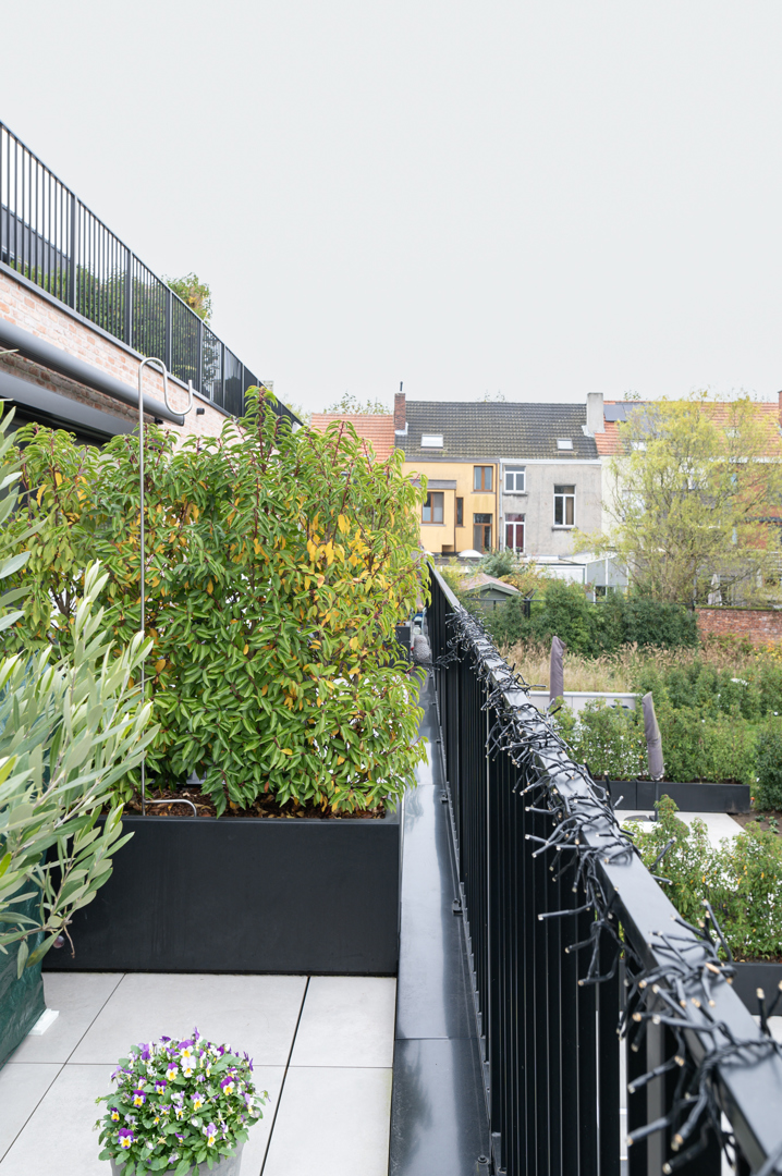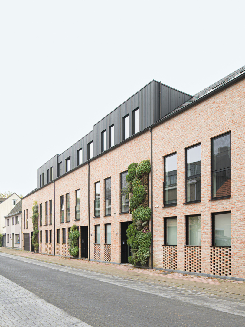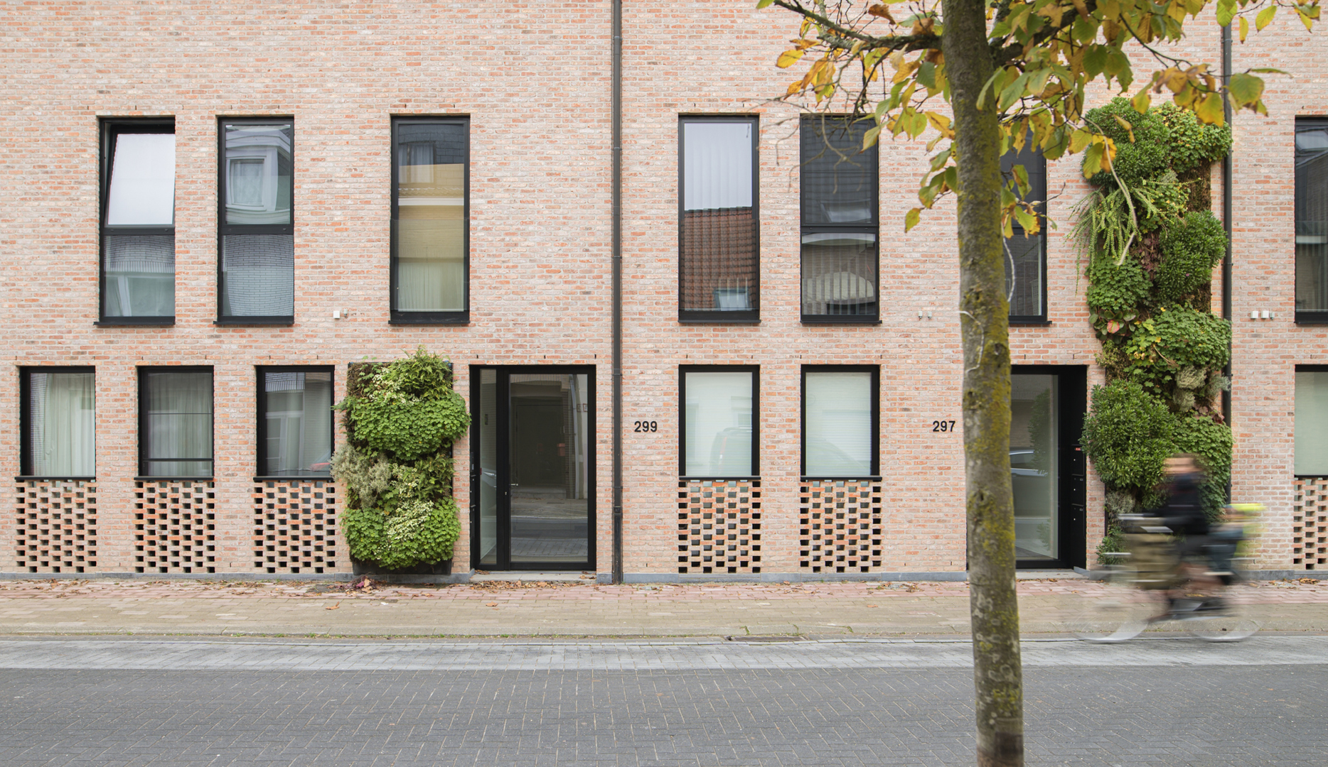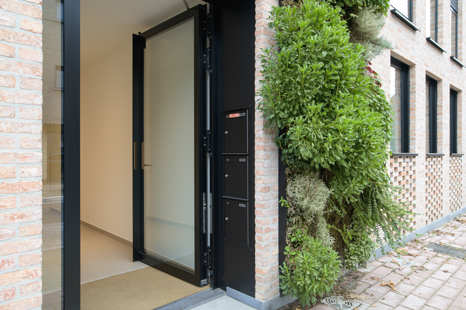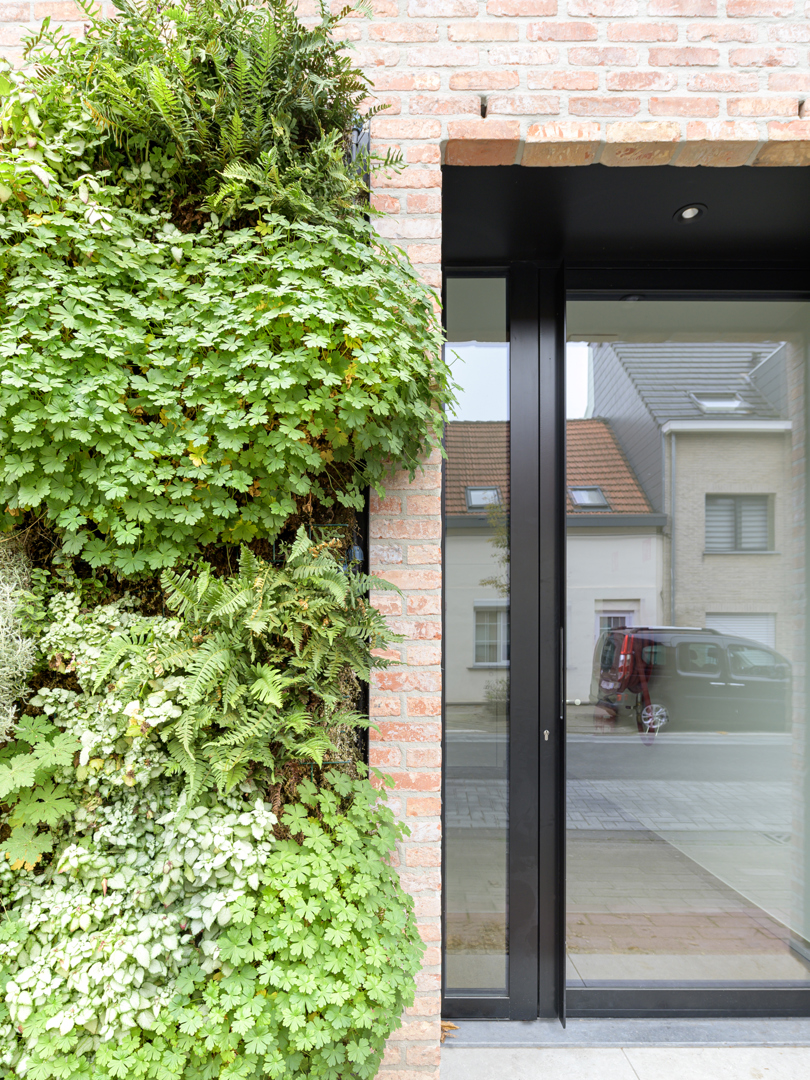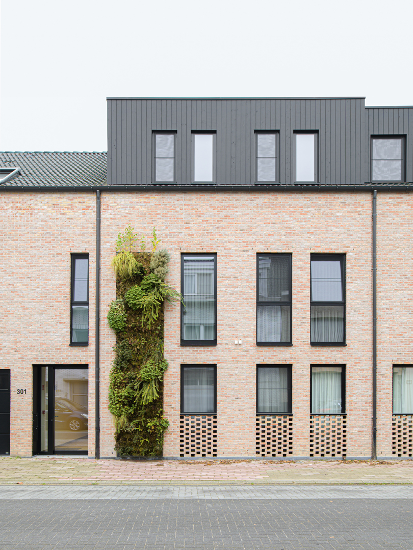 Groen vormt een expliciete rode draad doorheen het project. Aan de straatzijde zorgen muurtuinen voor een zachte vergroening van een verder volledig verharde context, met minimale irrigatie als uitgangspunt. Ook de zijgevel kreeg een groene bekleding, waardoor het volume zich losmaakt van zijn perceelsgrenzen. Aan de achterzijde fungeren geïntegreerde plantenbakken als natuurlijke scheidingen tussen de balkons, die bewoners zelf kunnen invullen en laten meegroeien met hun woongebruik.