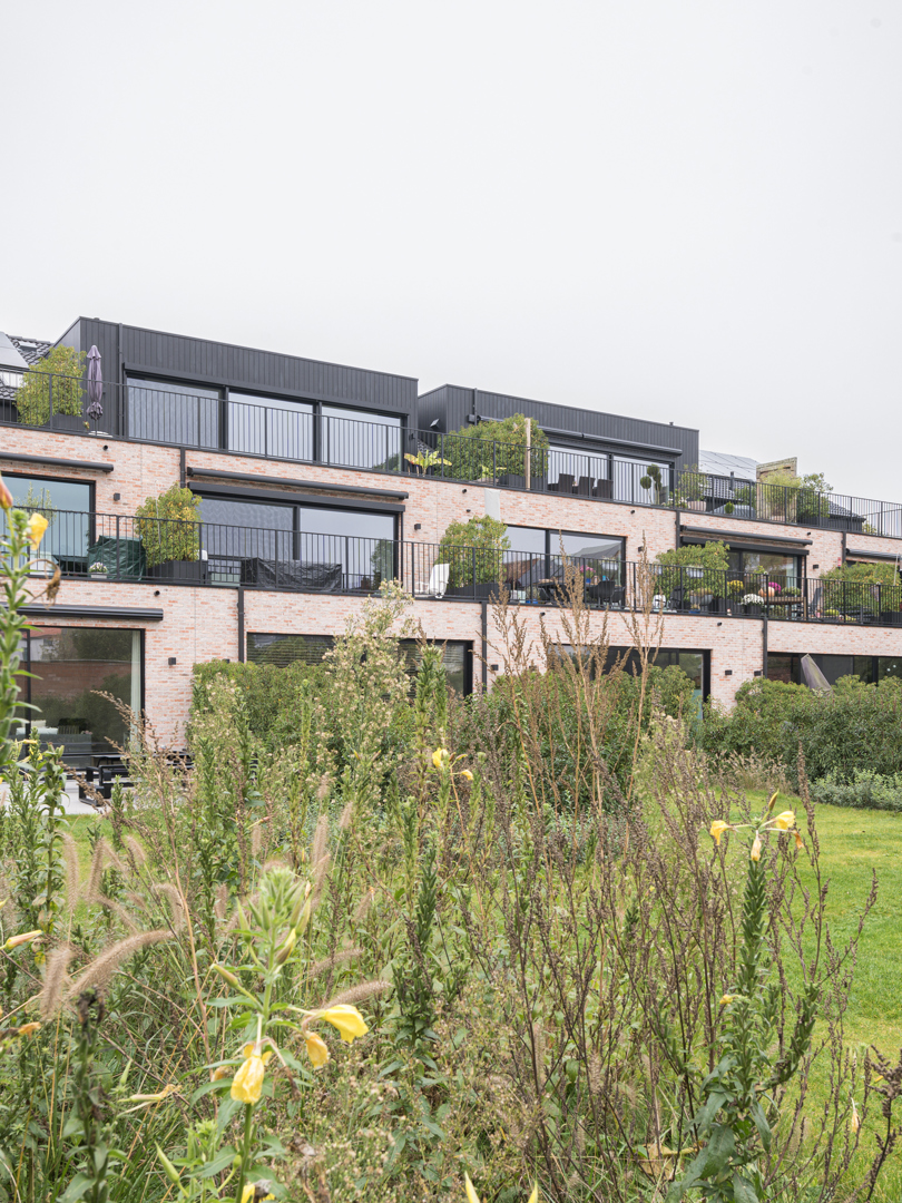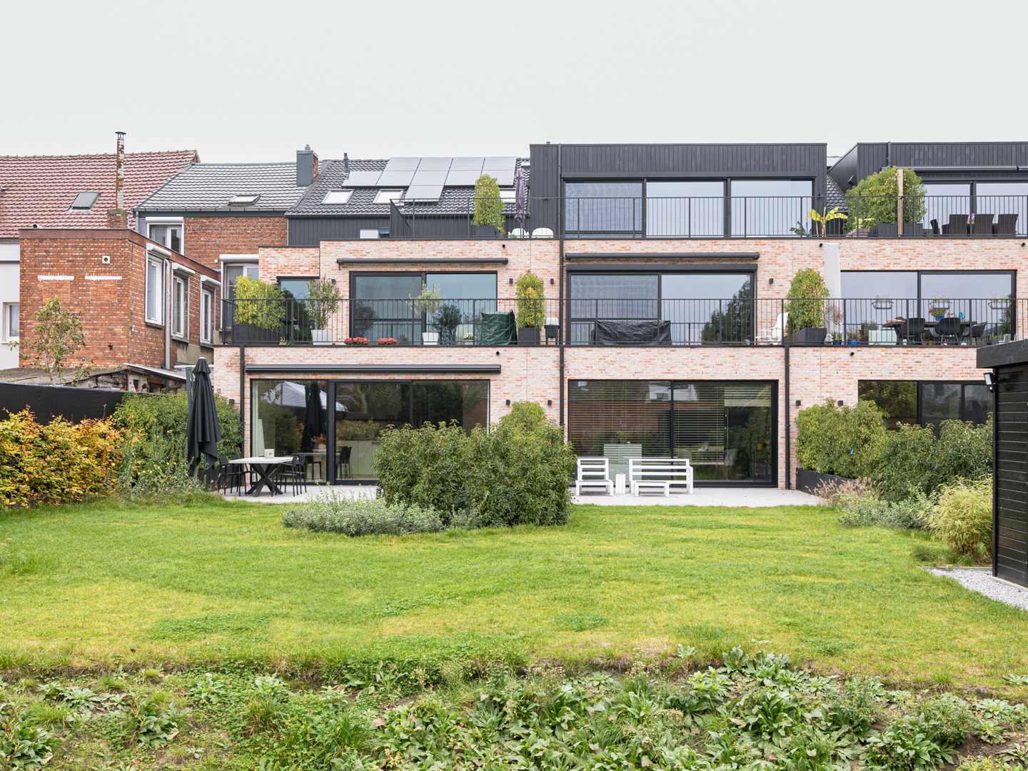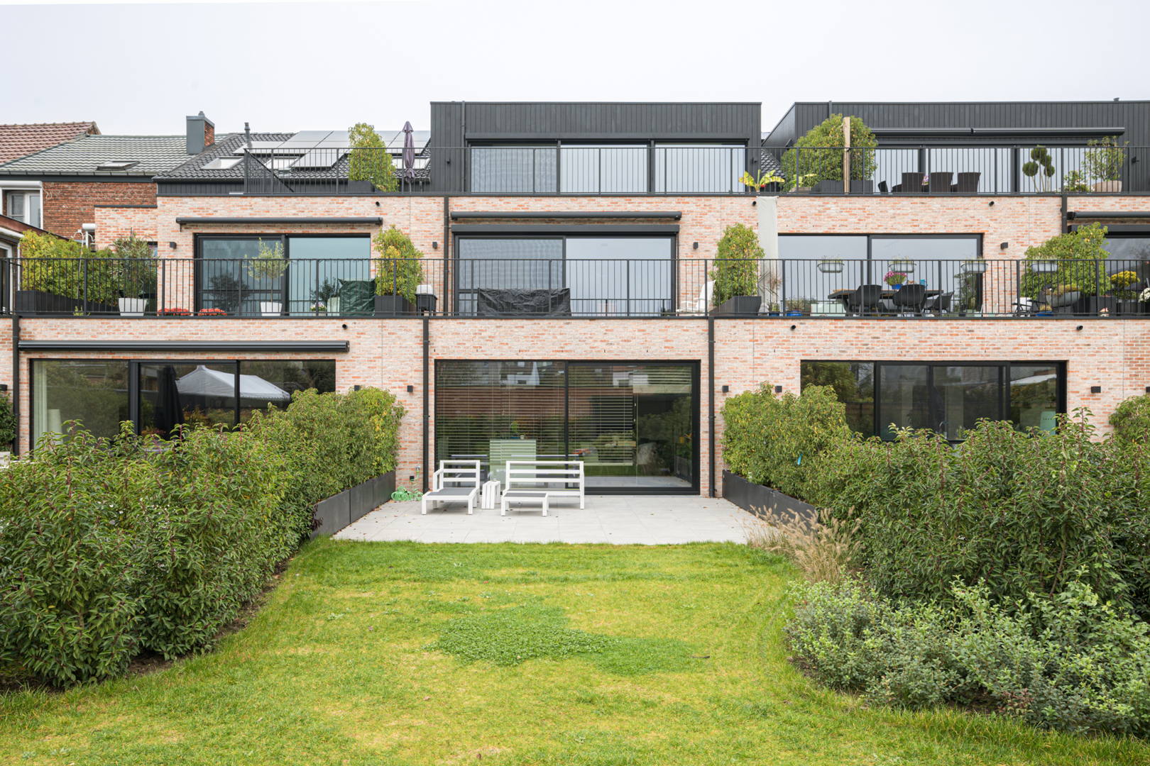 De achtertuin vormt het collectieve hart van het project en is ingericht met een wadi die water opvangt en vertraagd afvoert. De gelijkvloerse appartementen delen deze tuin rechtstreeks, terwijl de bovenliggende woningen uitkijken op het groen. Die opbouw versterkt de relatie tussen privé en collectief, zonder de privacy van de bewoners uit het oog te verliezen. De tuin fungeert tegelijk als ecologische buffer en als kwaliteitsvolle buitenruimte in een dense woonomgeving.
