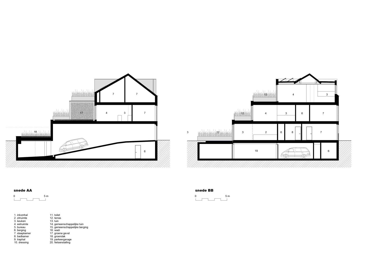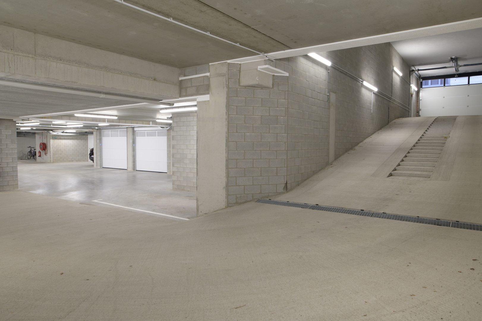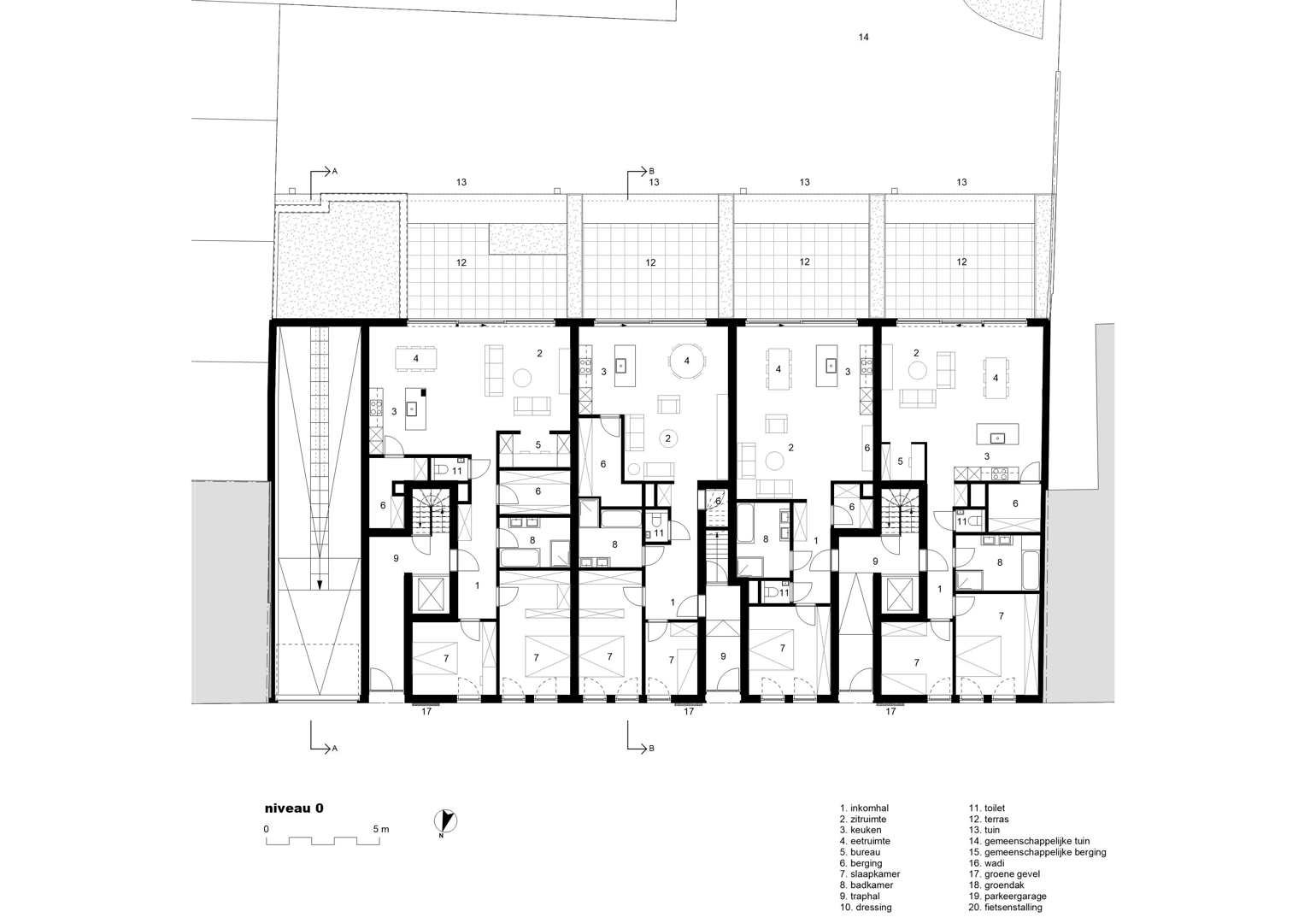 De achtertuin vormt het collectieve hart van het project en is ingericht met een wadi die water opvangt en vertraagd afvoert. De gelijkvloerse appartementen delen deze tuin rechtstreeks, terwijl de bovenliggende woningen uitkijken op het groen. Die opbouw versterkt de relatie tussen privé en collectief, zonder de privacy van de bewoners uit het oog te verliezen. De tuin fungeert tegelijk als ecologische buffer en als kwaliteitsvolle buitenruimte in een dense woonomgeving.
