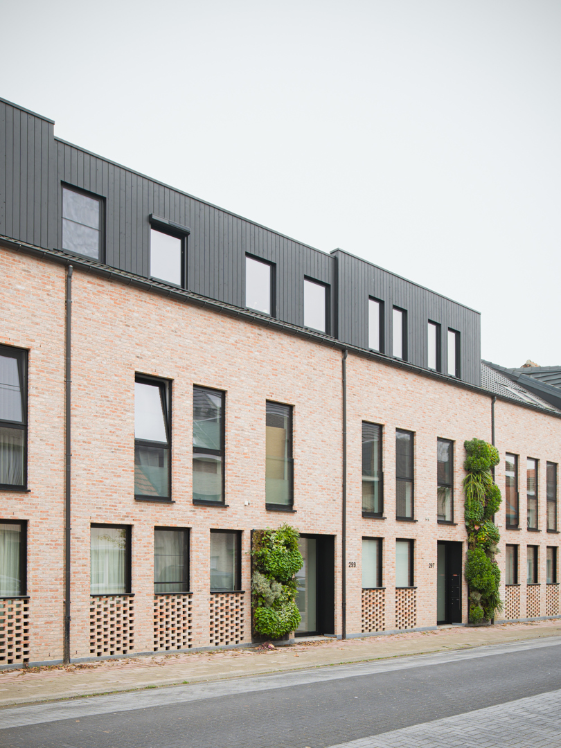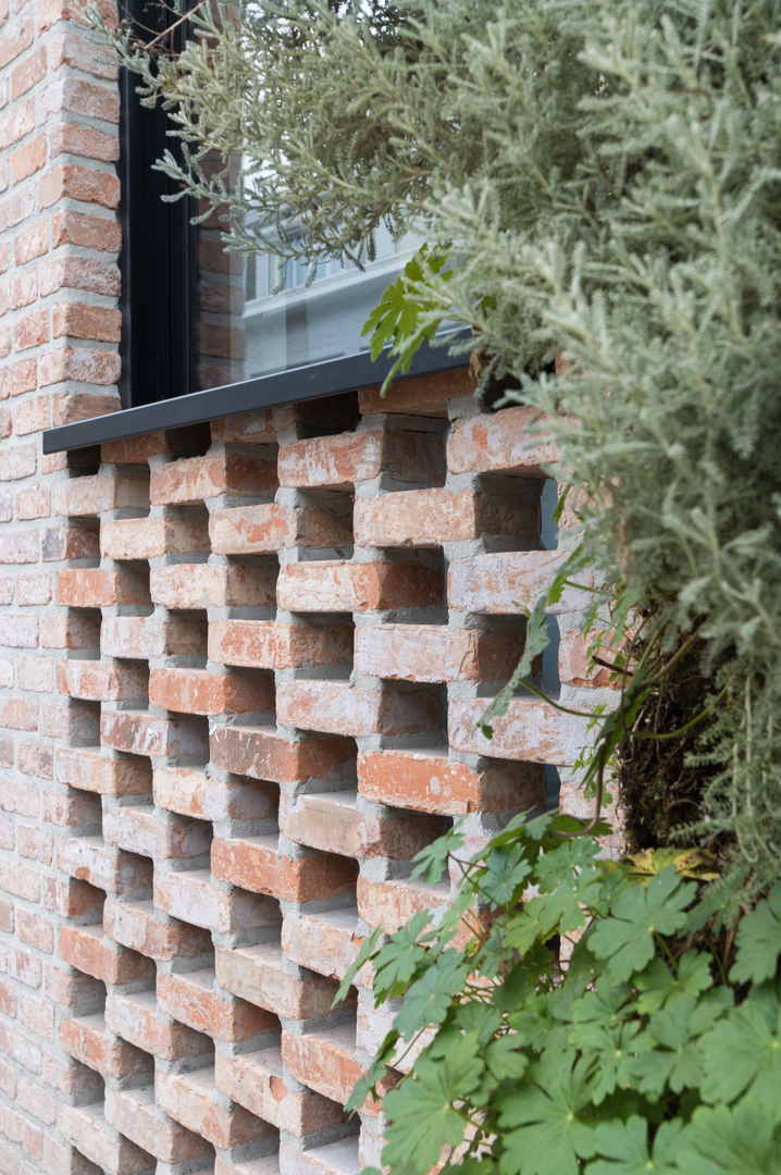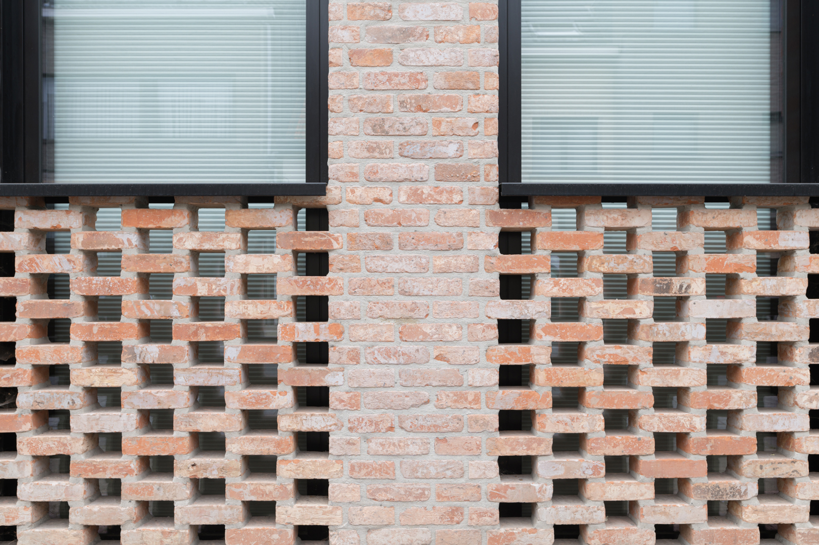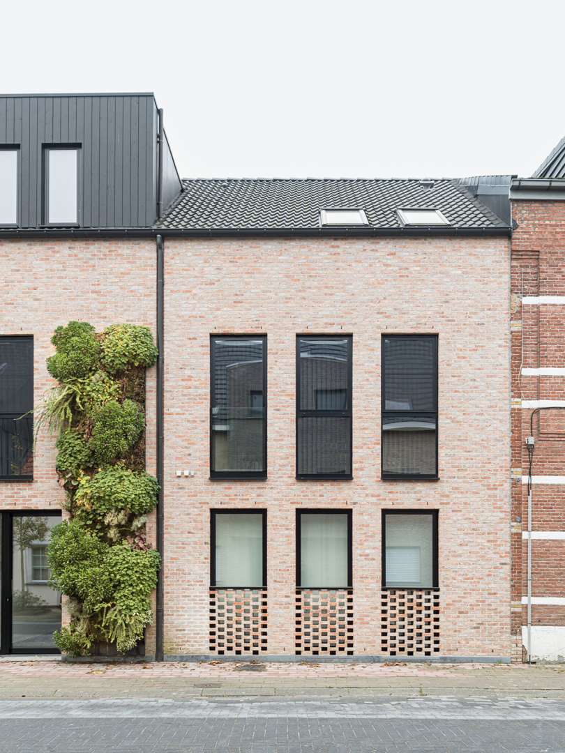 De voorgevel is consequent opgebouwd met één raamtypologie, wat zorgt voor rust en samenhang. Op het gelijkvloers introduceert een claustra-metselverband meer privacy zonder licht weg te nemen, terwijl de kleinere ramen op de bovenste verdieping verwijzen naar de lokale bouwstijl van het begin van de twintigste eeuw. De dakkapellen zijn afgewerkt in zwart gebrand hout, gekozen omwille van duurzaamheid en beperkt onderhoud. Zo ontstaat een gevel die tegelijk hedendaags is en geworteld in haar omgeving.