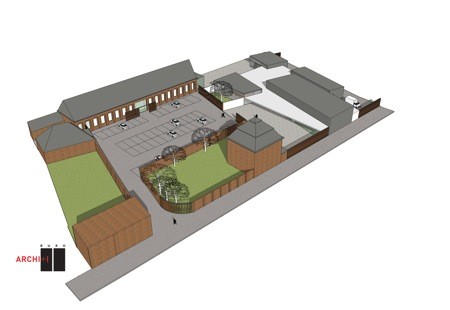 De aanwezigheid van baksteen wanden op en rond de site zijn een beeldbepalend element in de bestaande structuur: ze omsluiten de gebouwen waardoor ’buitenkamers’ ontstaan die integraal deel uitmaken in het gebruik van de ganse site. Vanuit deze kamers en via informele routes krijg je toegang tot het jeugdhuis en het stadspark. In het ontwerp wordt het intieme karakter van de bestaande site behouden en bevestigd. Luchtige binnenkamers worden afgewisseld met ommuurde buitenkamers, die samen een harmonisch geheel vormen. De houten lamellenwand zorgt voor een scheiding van de verschillende ruimtes, maar biedt tevens subtiele doorzichten en een vorm van sociale controle.