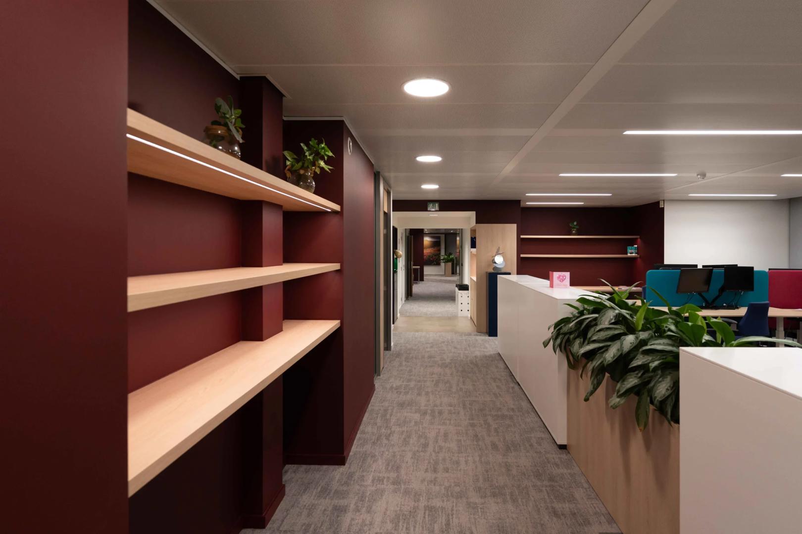 Warm houtfineer, zachte kleuren en tactiele materialen creëren een verfijnde, professionele uitstraling. Maatwerkmeubilair van Jansen Joinery zorgt voor een uniforme lijn doorheen het volledige kantoor. De combinatie van open en gesloten zones, flexibele werkplekken en uitnodigende meetingrooms maakt van het gebouw een dynamische werkomgeving die inspeelt op verschillende werkstijlen.