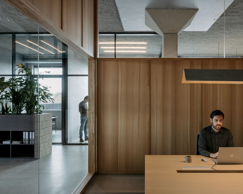 Achter de betonblokken staat ook een houten volume uit Europese Lariks met daarin onder andere een groot kantoor, een stalenkamer en de sanitaire ruimte. Volgens Geysen twijfelde het team eerst of de betonblokken dan nog nodig waren, maar uiteindelijk is die gelaagdheid volgens hem net boeiend. Hoewel de stalenkamer en sanitaire ruimte volledig afgezonderd is, is het kantoor in het houten volume voorzien van veel glas waardoor er visueel contact is met het landschapskantoor. De bovenkant van het afgesloten kantoor bestaat aan de kant van de betonblokken voor een derde uit glas. Aan de zijde die aan de werkplekken grenst, is dan weer bijna heel de onderkant voor twee derde uit glas.