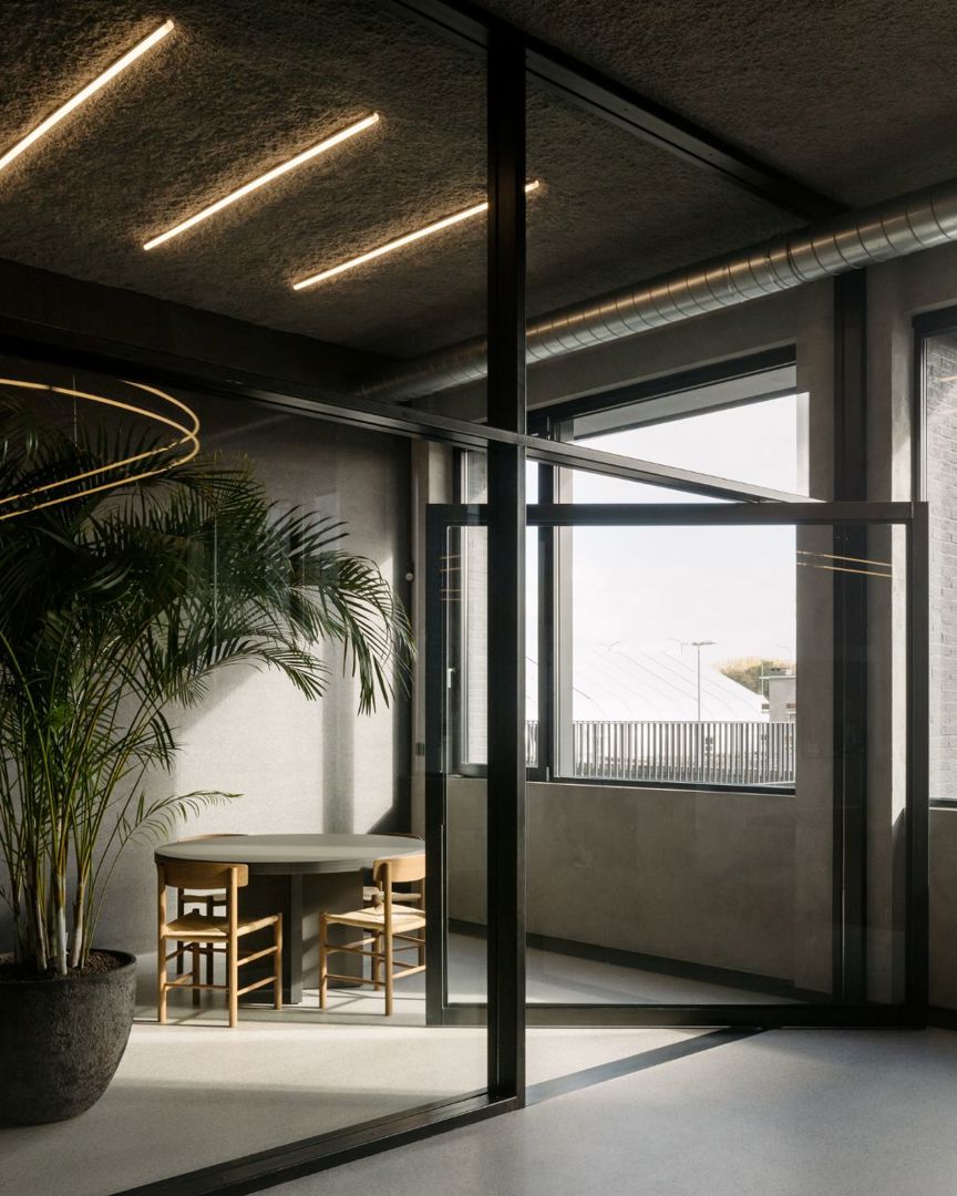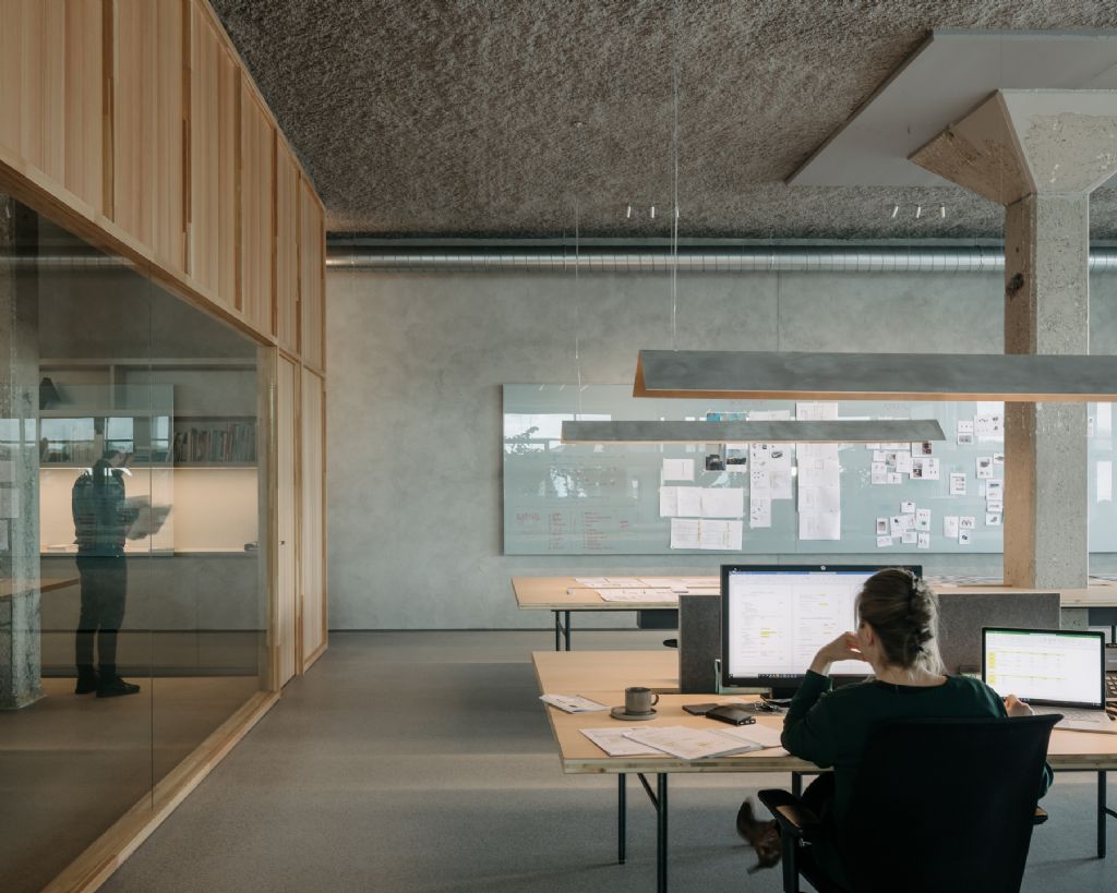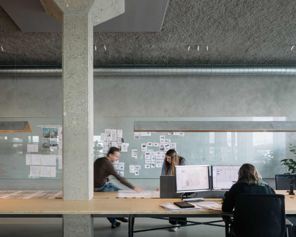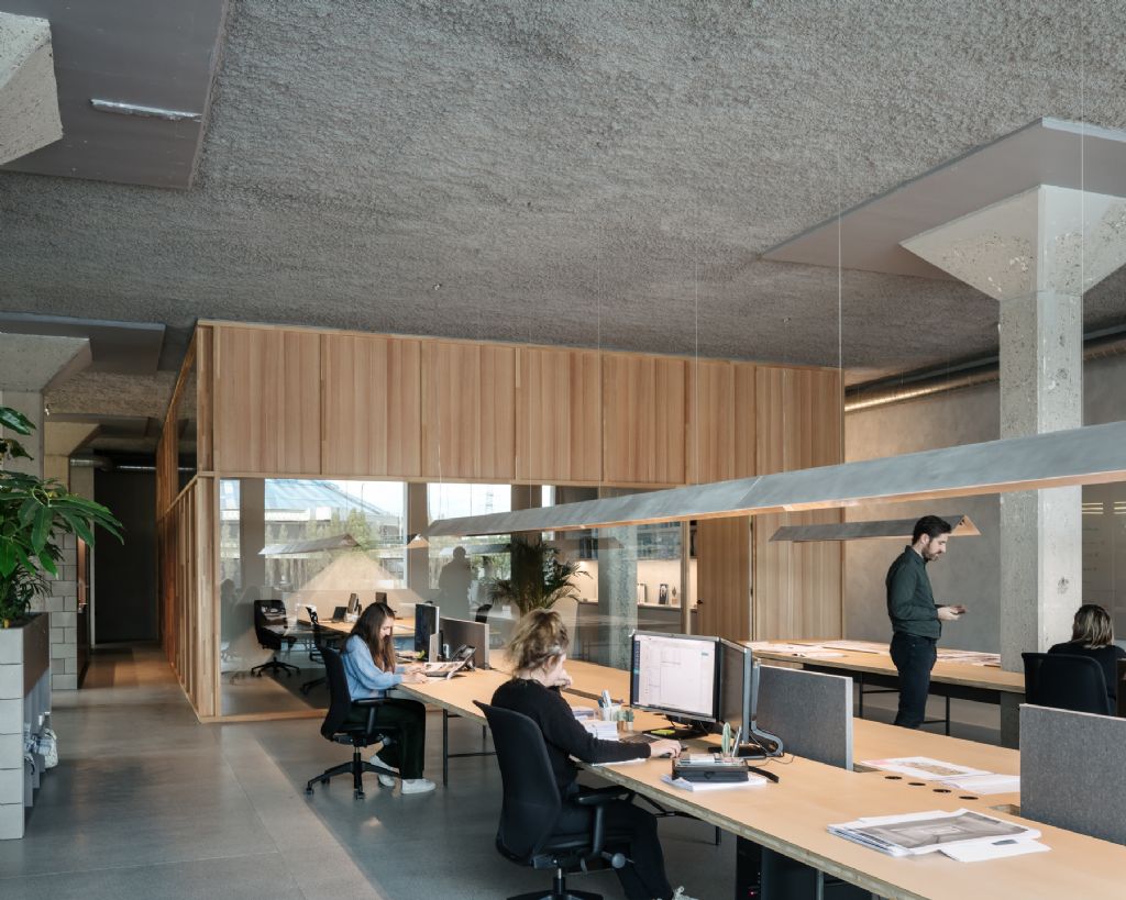 De materialen zijn ook vanuit een duurzaam en circulair oogpunt gekozen. Zo bestaat de vloer uit geslepen beton waarin riviergrind zichtbaar is en is het plafond uitgevoerd in een akoestische spuitpleister uit grijs geverfde krantensnippers. Door overal dezelfde vloer- en plafondafwerking toe te passen, blijft de ruimte ook in de toekomst vlot aanpasbaar. De akoestische scheidingswanden op de bureaus zijn dan weer gemaakt uit het circulaire product Really van Kvadrat. Dat materiaal is ook gebruikt om de gipswanden tussen de vergaderzalen te bekleden. Die ruimtes zijn bovendien afgestemd op de breedte van een gipsplaat om afval te beperken.