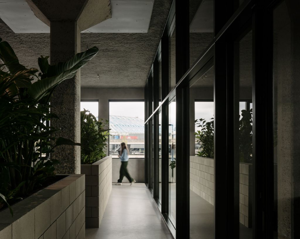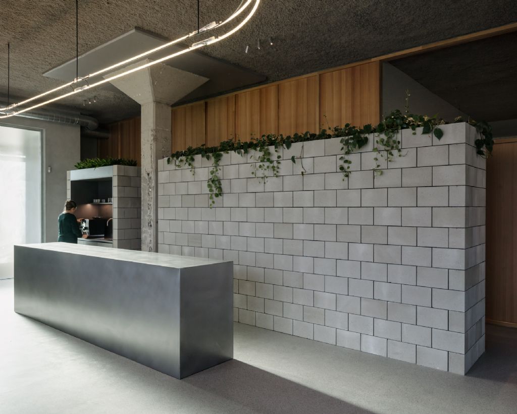 In het kantoor hangt een industriële sfeer waar de groene planten en het hout zorgen voor extra warmte. Het materialenpalet bestaat uit een variatie van ruwe en onafgewerkte bouwelementen. De betonblokken zijn bijvoorbeeld niet gevoegd. “Ze kunnen in principe uit elkaar gehaald worden en op een andere plaats terug opgebouwd worden”, vertelt Geysen. “De keuze voor de juiste betonblokken was ook echt een proces van trial and error, maar door de pandemie hadden we het iets rustiger. Daardoor konden we meer energie steken in de renovatie van ons kantoor. Zo zijn we ook lang op zoek geweest naar een goede kleur voor de grote vierkanten boven de kolommen.”