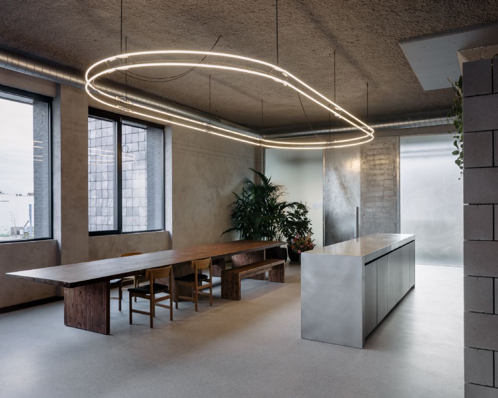 Wie binnenkomt door de gegalvaniseerde deuren met de matte, industriële beglazing, wordt verwelkomd door een grote houten tafel opgebouwd uit gelamineerde balken van Rotor DC. Een groot neonarmatuur verlicht de ruimte en verwijst op een subtiele manier naar een slachtlijn van het vroegere slachthuis. Daarachter zijn drie verschillende vergaderzalen met elk hun eigen functie te vinden. In de ene komt de gebruiker binnen door een pivoterende deur en staat een kleine, ronde tafel. In de andere hangt dan weer een groot scherm boven een kleine tafel voor online meetings. De laatste vergaderzaal is de grootste en wordt gebruikt voor vergaderingen in grotere groepen. De glazen wanden in de demonteerbare staalstructuur van de vergaderzalen zorgen voor een open gevoel.