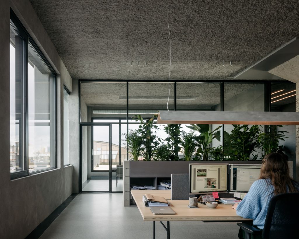 De scheiding tussen de vergaderzalen, waar de interieurarchitecten hun klanten ontvangen, en de grote werkruimte gebeurt op een zachte manier door grote betonblokken, die uitgelijnd zijn met drie grote kolommen. Die betonblokken vormen volumes met erbovenop verschillende planten. De betonblokken zijn ook gesloten in de semi-publieke zone, maar aan de kant van de werkplekken zijn ze open en wordt het volume gebruikt als opbergruimte. “Dat vormt bovendien een soort van routing zodat je niet meteen het landschapskantoor i duikt”, zegt interieurarchitect en oprichter van PUUR Jan Geysen.