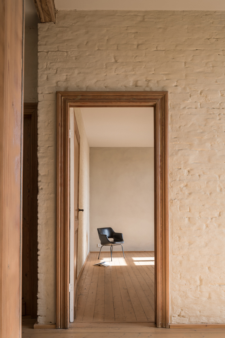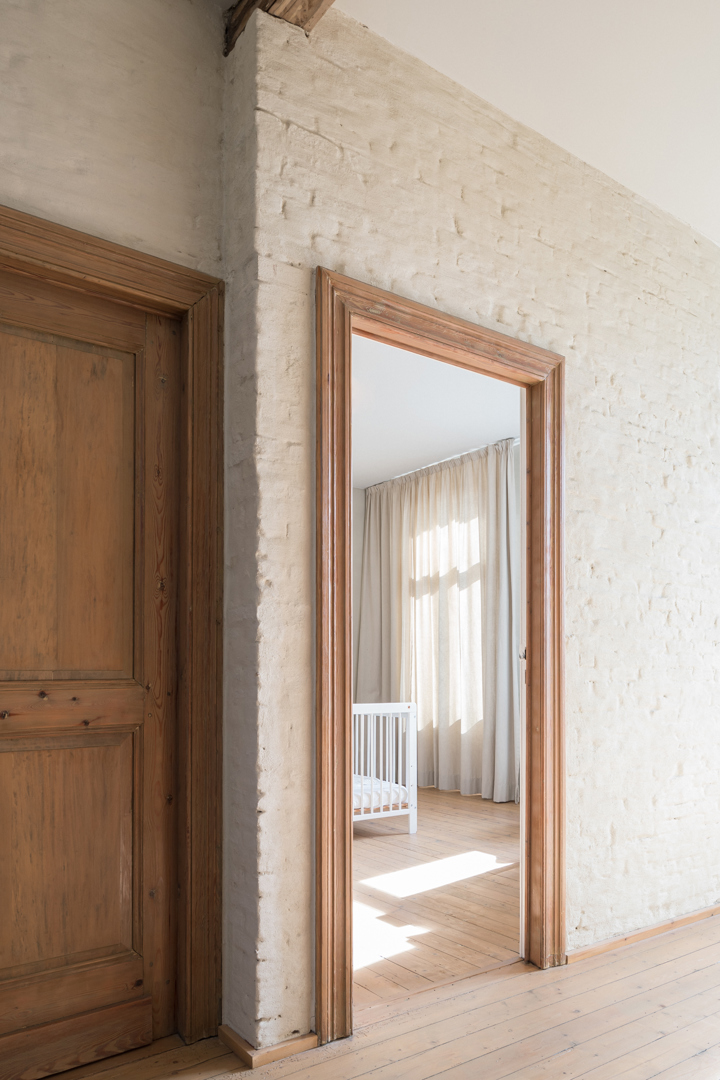 De binnenmuren werden ruw gezet tot op de naakte baksteen, opnieuw gevoegd en gekaleid met leempleister en afgewerkt met leemverf. De andere technieken dan die voor de wandverwarming werden in opbouw op de muren geplaatst, zodat ze goed bereikbaar blijven voor onderhoud, herstellingen en eventuele aanpassingen. Omdat de vloeren behouden bleven werd om het vloerpakket te isoleren geopteerd om de plafonds open te werken, te isoleren en af te werken met Fermacell-platen, gemaakt van gips- en papiervezels afkomstig van gerecycleerde materialen.