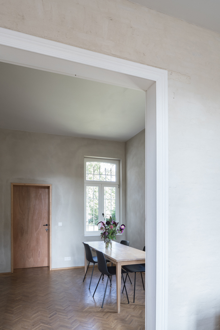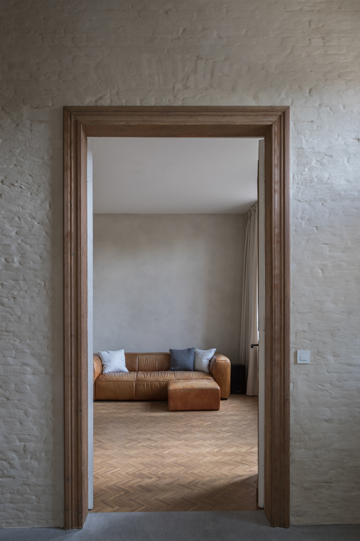 Naar binnen dan. Daar luidde het eerste credo: zo veel mogelijk materialen behouden om zo weinig mogelijk materialen te hoeven toevoegen en de CO2-uitstoot van de renovatie maximaal te beperken. Het interieur werd met dat doel minutieus ontmanteld. De houten vloeren werden behouden waardoor ook de plinten en deurkaders niet verwijderd moesten worden. Ook kozen de architecten er bewust voor de indeling en de verticale circulatie van de woning te vrijwaren zodat zo weinig mogelijk moest worden opengebroken.