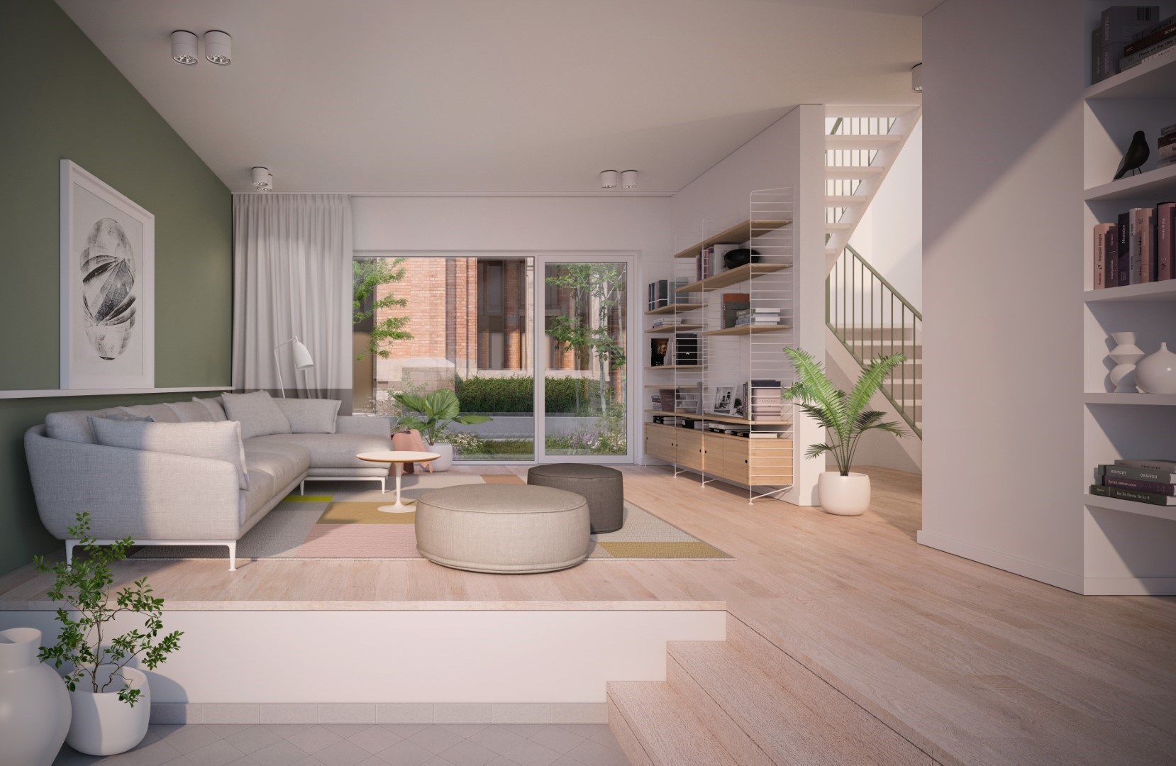 Op het niveau van het residentiële programma treffen we een 80-tal appartementen aan die verspreid liggen over twee gebouwen. Deze gebouwen delen telkens een langwerpige gemeenschappelijke tuin met een aantal grondgebonden woningen. Deze compacte terraswoningen hebben een ‘voordeur’ in de perimetermuur langs de straatzijde en verhogen opnieuw het contact met de omgeving.