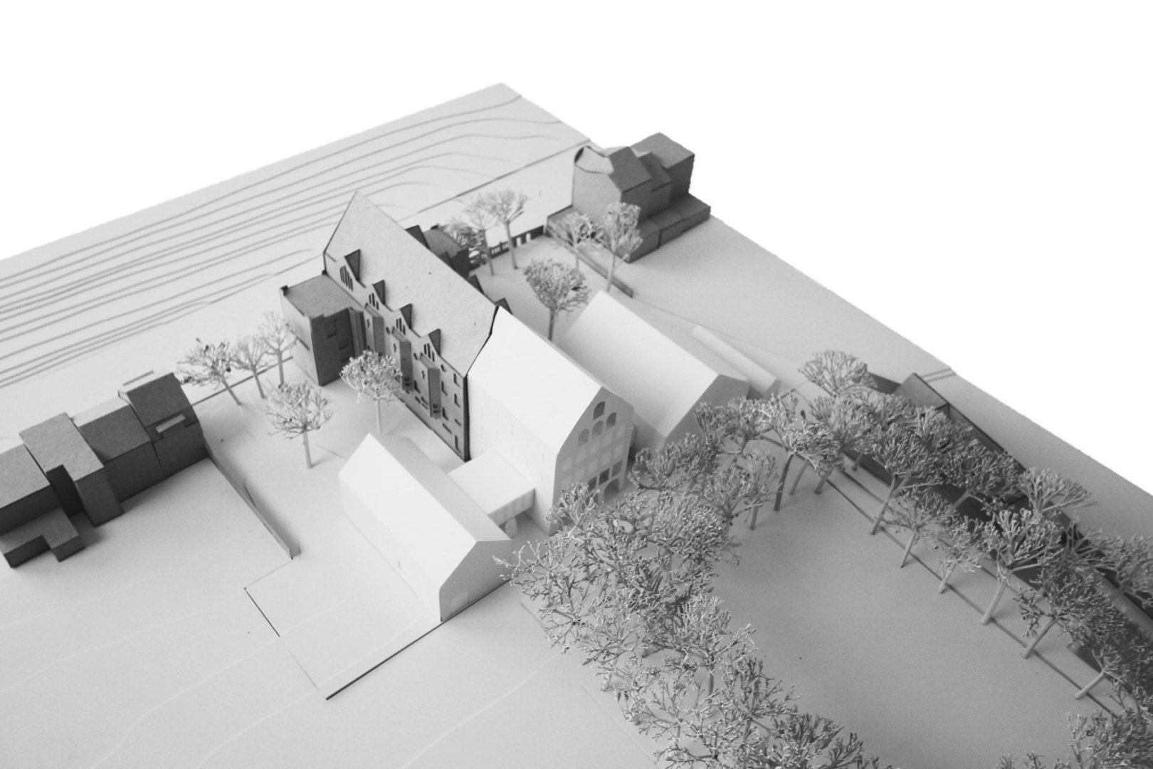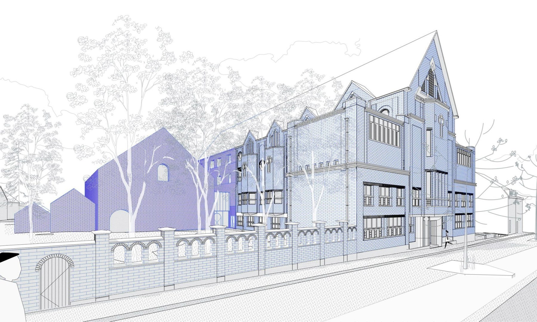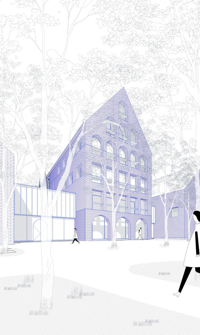 Het ontwerp genereert synergiën in ruimtegebruik en programma, maar organiseert ook (akoestische) afsluitbaarheid om de verschillende werkingen te respecteren. De integratie van het Victor Broosgebouw, een voormalige klooster dat voor de nieuwbouw ligt, door LAVA architecten omvat de transformatie van de kapel tot theaterzaal. Daarvoor, maar ook om het energieverlies te beperken, kwam er onder meer isolerende beglazing achter de gekleurde glasramen. Met een energetische totaalrenovatie in samenspraak met de dienst monumentenbeleid van de stad nam het architectenbureau ook de rest van het bestaande gebouw onder handen. Omdat de buitenzijde van het voormalige klooster beschermd is als stadsgezicht, krijgen de zwarte zonnepanelen op het dak een oranje kleur, zodat het oorspronkelijke uitzicht van het gebouw blijft bestaan.