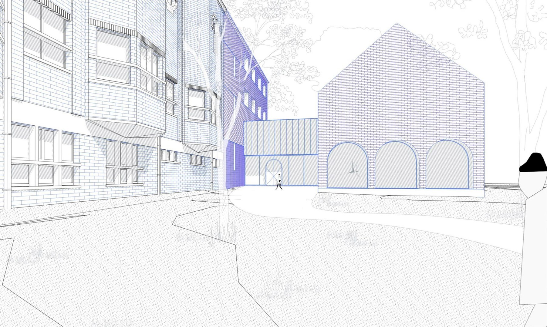Het nieuwe gebouw, een betonstructuur met een bakstenen gevel en een dak van gevelpanelen, deelt door zijn inplanting het park achter en rond het Victor Broosgebouw in vier kwadranten; wanneer het gebouw klaar is, zal de buitenruimte van de site een ontvangstpark, een rustige beeldentuin, een speelveld met lindebomen errond en een groot grasveld met plaats voor circustenten omvatten. Verschillende doorzichten doorheen het gebouw rijgen die parkclusters visueel aan elkaar.