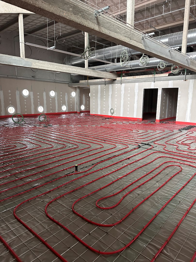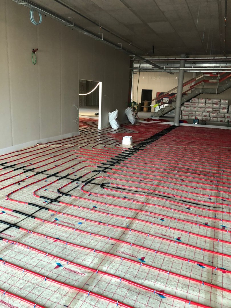 “In de gerenoveerde hal pasten we twee verschillende systemen toe: een tacker-systeem in combinatie met gespoten PUR-isolatie op het gelijkvloers, en een staalnet-systeem in combinatie met schuimbeton en akoestische matten op de eerste verdieping. Omdat de vloerverwarming een zeer groot onderdeel uitmaakte van de HVAC-installatie, werkte Thermoduct rechtstreeks samen met de hoofdaannemer.”
