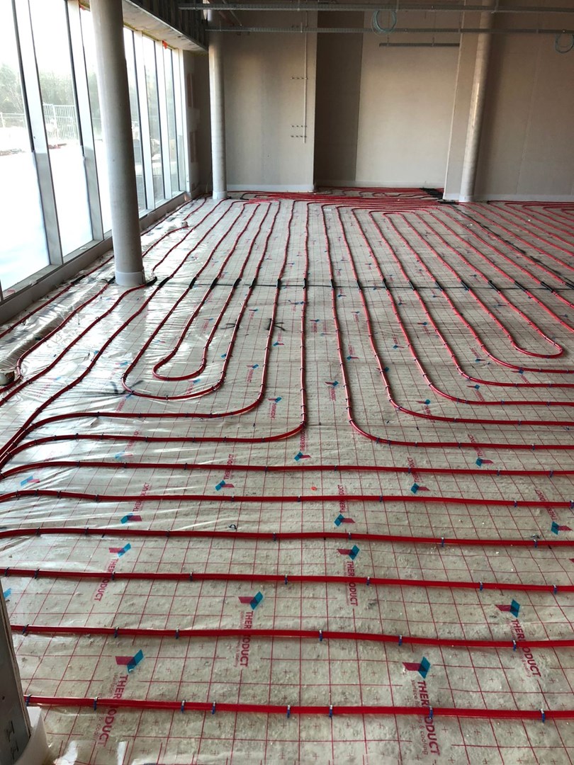 “Thermoduct stond bij dit project in voor de vloerverwarming in zowel een bestaande en beschermde grote hal als een naastliggende nieuwbouwtoren met klaslokalen. Samen waren deze gebouwen goed voor een totale oppervlakte van 16.000 m² die met vloerverwarming moest worden uitgerust”, aldus Lauman.