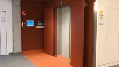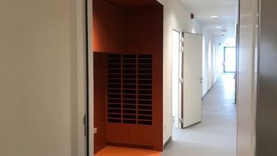 Toch fleuren afgeschuinde, koperbruine aluminiumpanelen rond de ramen de sobere gevels op. Die kleur komt ook regelmatig terug in het interieur van het gebouw. De ontvangstbalie, lift en kussens op de zetels in de wachtzaal zijn maar enkele elementen die het koperen kleurenpalet representeren. Ook de vormgeving van de passerelle tussen het oude en het nieuwe gebouw is iets meer uitgesproken. Die lagere en smallere verbindingsvleugel met kantoren en vergaderzalen bestaat zo goed als volledig uit glas.