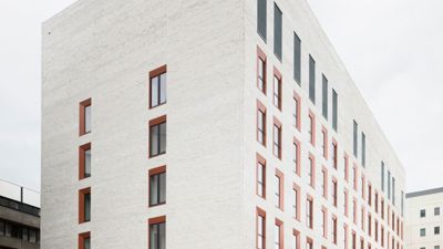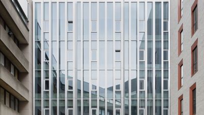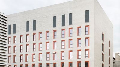 Ook het exterieur volgt die modulaire opbouw van de laboruimtes. De bijna identieke raampartijen zijn geplaatst met de situering van de labotoestellen en een maximale lichtinval in het achterhoofd. De sobere, lichtgrijze bakstenen gevels krijgen zo dus een strak ritme. “Het gebouw is ingepland op een toenmalige restruimte langs de ringweg aan de noordzijde van Campus Gasthuisberg, op een hellend perceel”, zegt Marie Van den Driessche van Abscis Architecten. “Het wordt omgeven door een mix van oudere en recentere onderzoeksgebouwen, waardoor er werd geopteerd om het nieuwe gebouw geen uitgesproken eigen identiteit te geven.”