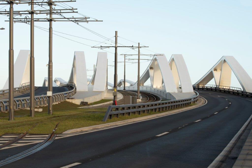“Ik was er ook al snel van overtuigd dat we drie evenwijdige bruggen moesten maken die samen één visueel geheel vormen: een centrale trambrug en twee autobruggen met twee rijstroken, die geflankeerd worden door afgescheiden fiets- en voetpaden. Zo kunnen de verschillende verkeersstromen niet in elkaars vaarwater komen. Die drieledige opbouw maakt natuurlijke lichtinval onder de bruggen mogelijk en kwam bovendien goed uit voor de fasering. In eerste instantie zijn de oostelijke autobrug en de trambrug gerealiseerd. Nadien werd het verkeer overgezet op de nieuwe brug, is de oude brug afgebroken en kon tot slot ook de westelijke autobrug op zijn plaats geschoven worden.”