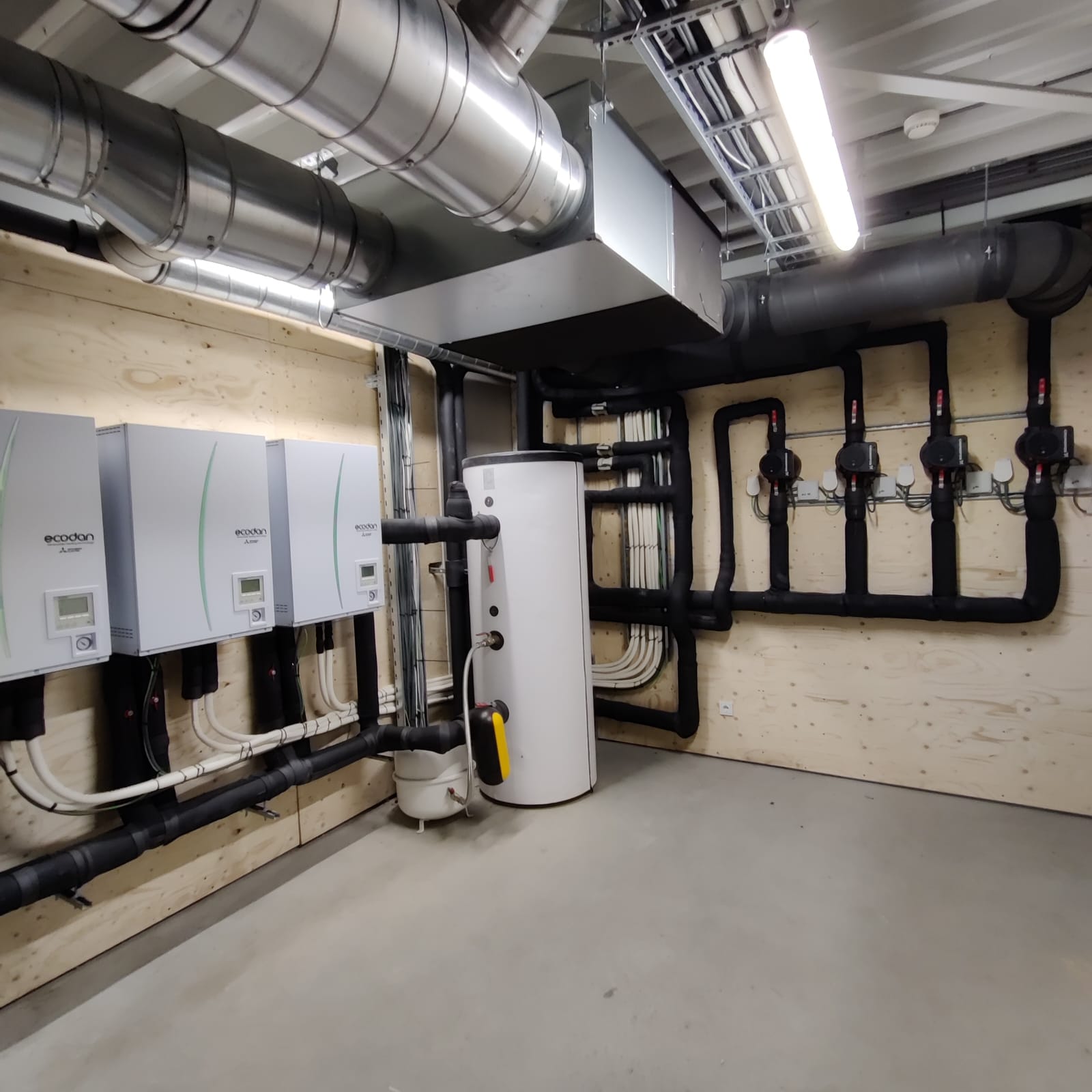 De technische uitrusting van het gebouw is afgestemd op de uiteenlopende functies van de verschillende ruimtes. De werkplaats, showroom en kantoren hebben elk hun eigen gebruikspatroon en comforteisen. Daarom koos Intellisol voor een combinatie van systemen, afgestemd op de noden van elk deel van het gebouw.