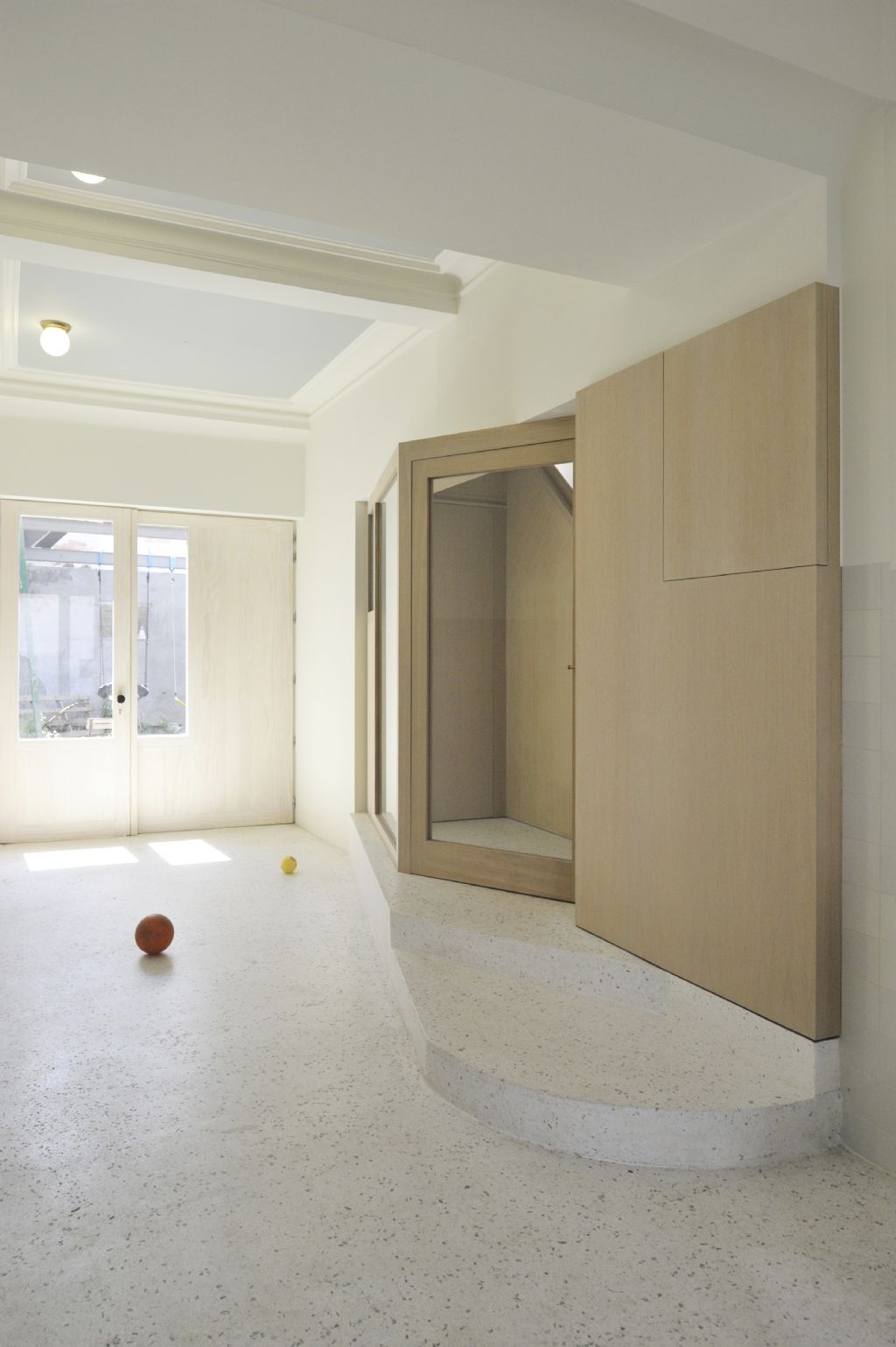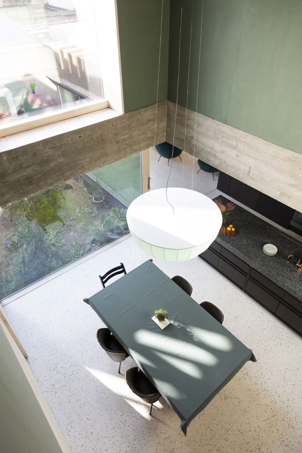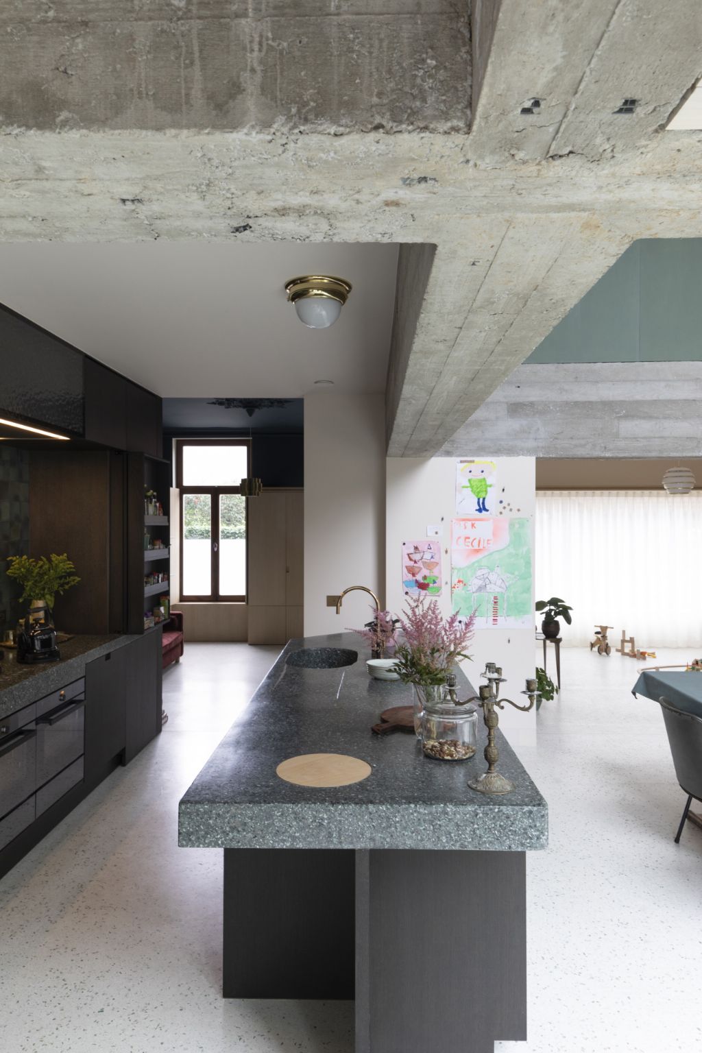 De belangrijkste ruwbouwelementen, zoals het nieuwe gewelf of het betonnen kruis dat onder de bestaande woningen is gestort, zijn uitgewerkt in brute plankenbekisting en bakenen specifieke ruimtes af, terwijl een doorlopende witte terrazzovloer met groene granulaten de ruimtes verbindt. Het eiken meubilair en het accoya schrijnwerk zorgen voor extra tactiliteit en precisering van de ruimtes.