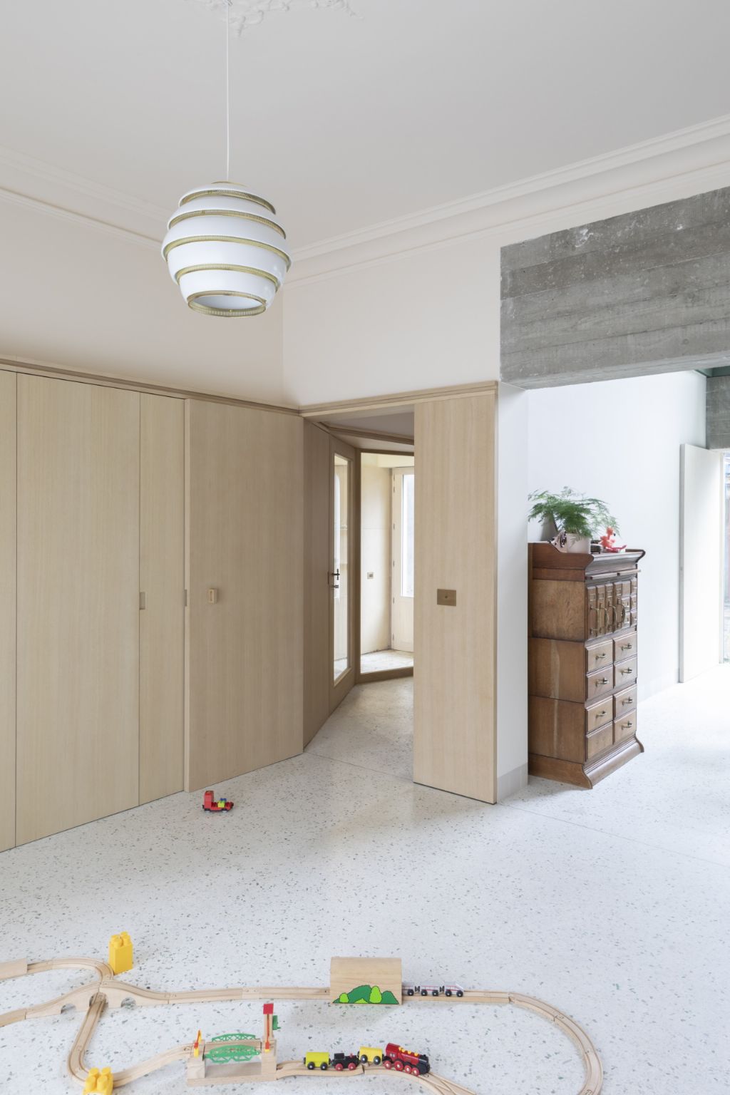 Net toen het gezin groeide en er meer ruimte gezocht werd, was er een opportuniteit om de aanpalende woning aan te kopen. De opdracht luidde om twee woongelegenheden om te vormen tot één huis. De doorgang van het linkerpand naar de achtergelegen oude stallingen was een grote meerwaarde en bood de mogelijkheid de woningen op een andere manier te benaderen en samen te voegen.
