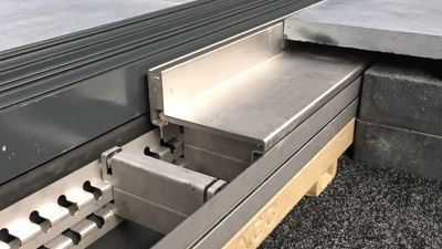 Wat is de rol dan van het tussenelement? Het tussenelement uit inox, met doorlopend waterinloopprofiel en extra sijpelgaten, klemt het EPDM-membraan (dikte 1,14 of 1,52 mm) van onder het raam in de polyesterbetonnen goot. Op die manier verdwijnt het sijpelwater uit de raamprofielen in de goot (“Secondary Drainage”). Waterinfiltratie naar binnen toe wordt 100 % uitgesloten.