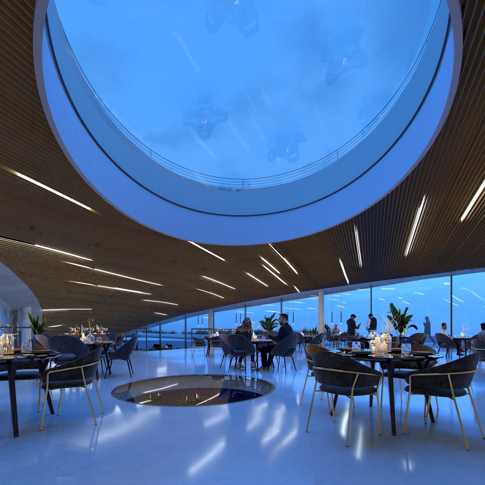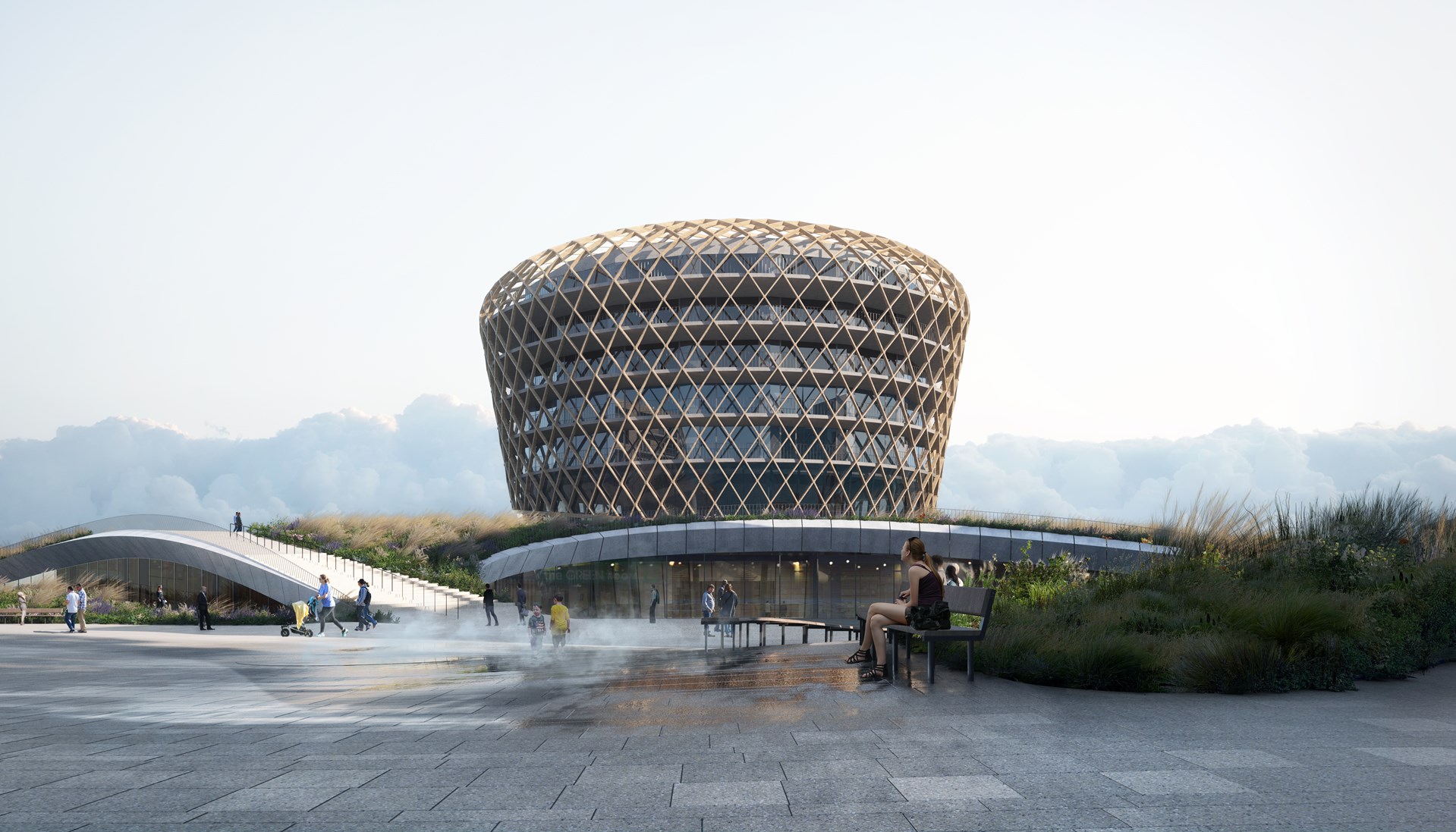 Verbonden aan het evenementengebouw is het strandhotel, met zijn raadselachtige, sculpturale silhouet, een ingehouden icoon met een open raster van gekromde balken van accoya hout. Het hele ontwerp optimaliseert de processen van energievoorziening, afvalverwerking en productie en past, waar het kan herbruikbare materialen toe.