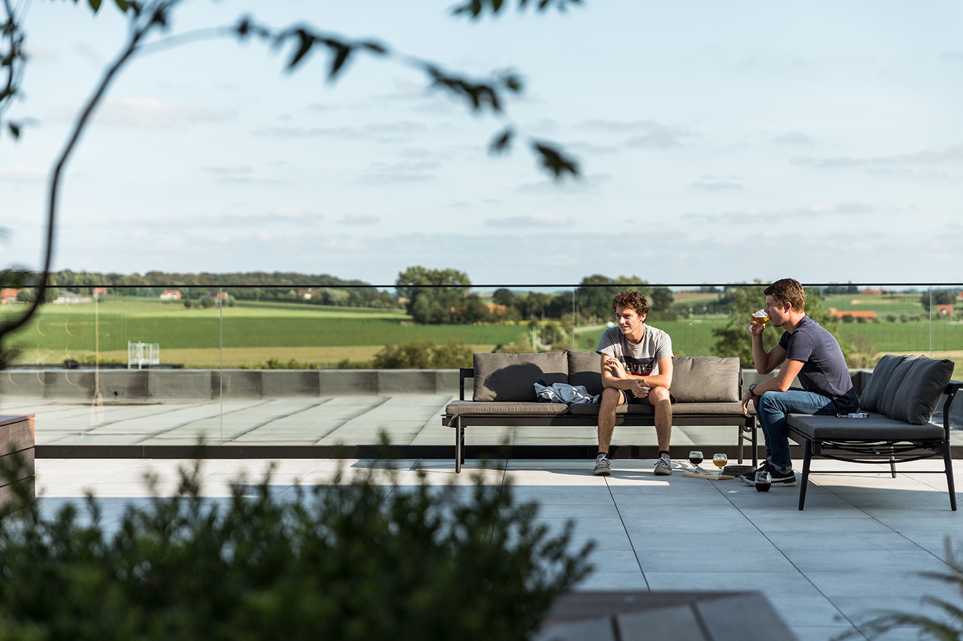 ‘Bar Bernard’: zo heet het brouwerijcafé pal op het dak van het kersverse bezoekerscentrum van Brouwerij St. Bernardus in Poperinge. Het ontwerp is naar de hand van architecte Marie Lecluyse en Extremis stond in voor de aankleding. De zitoplossingen zijn zo gekozen dat ze zorgen voor intimiteit en tegelijkertijd weinig plaats innemen.