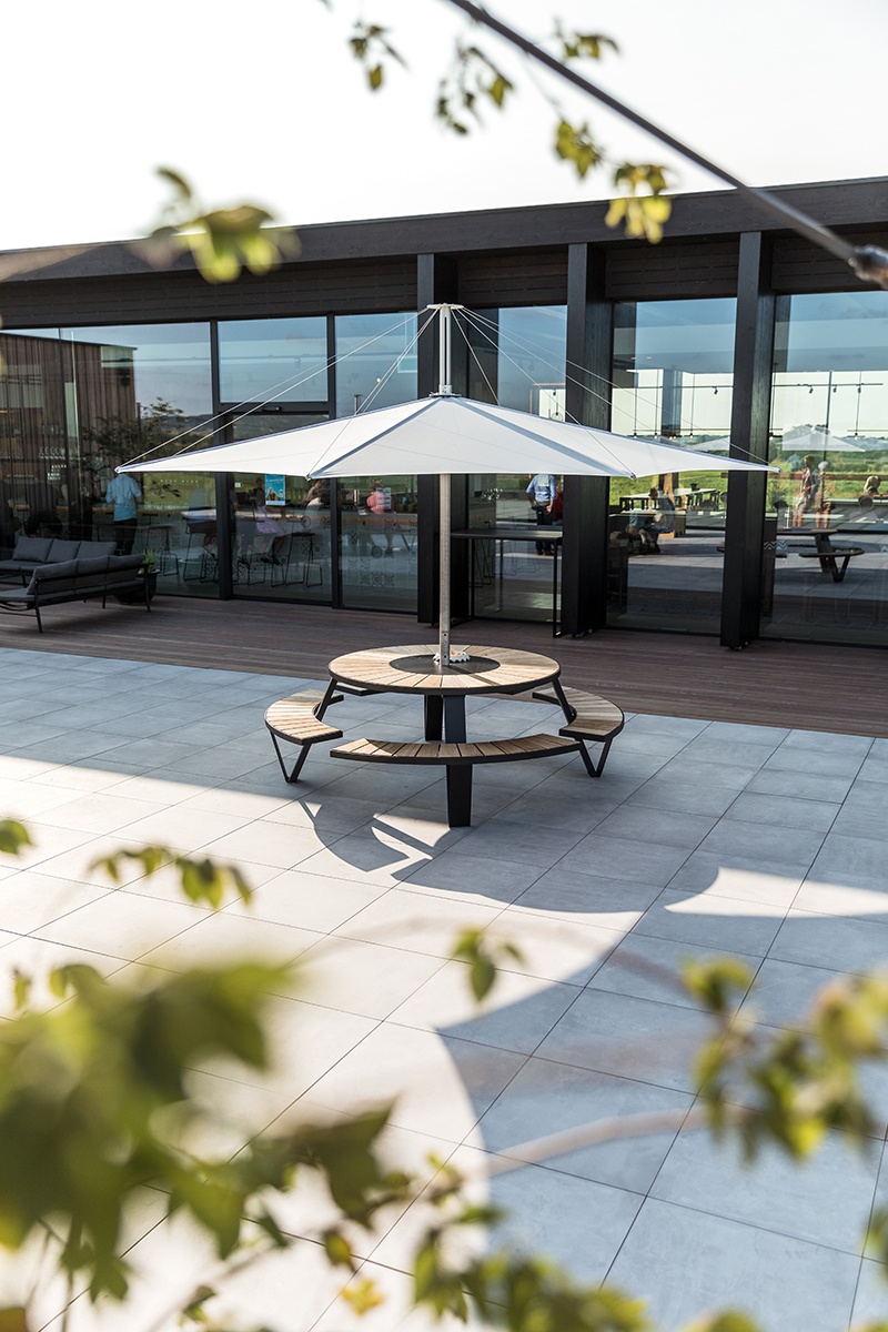 Wie in de schaduw wil vertoeven, neemt best plaats aan de zwart gekleurde Pantagruel-picknicktafels die onder de Inumbra-parasols staan. Op de tafels zelf staat een Lazy Susan, een draaibaar dienblad om voedsel op te delen. Voor degenen die vooral willen onthaasten, is de loungeset Sol+Luna's voorzien. De zithoek is compact, eigentijds en neutraal van kleur. Het biedt plaats aan zes personen en kan uitgeklapt worden tot een ligbed.