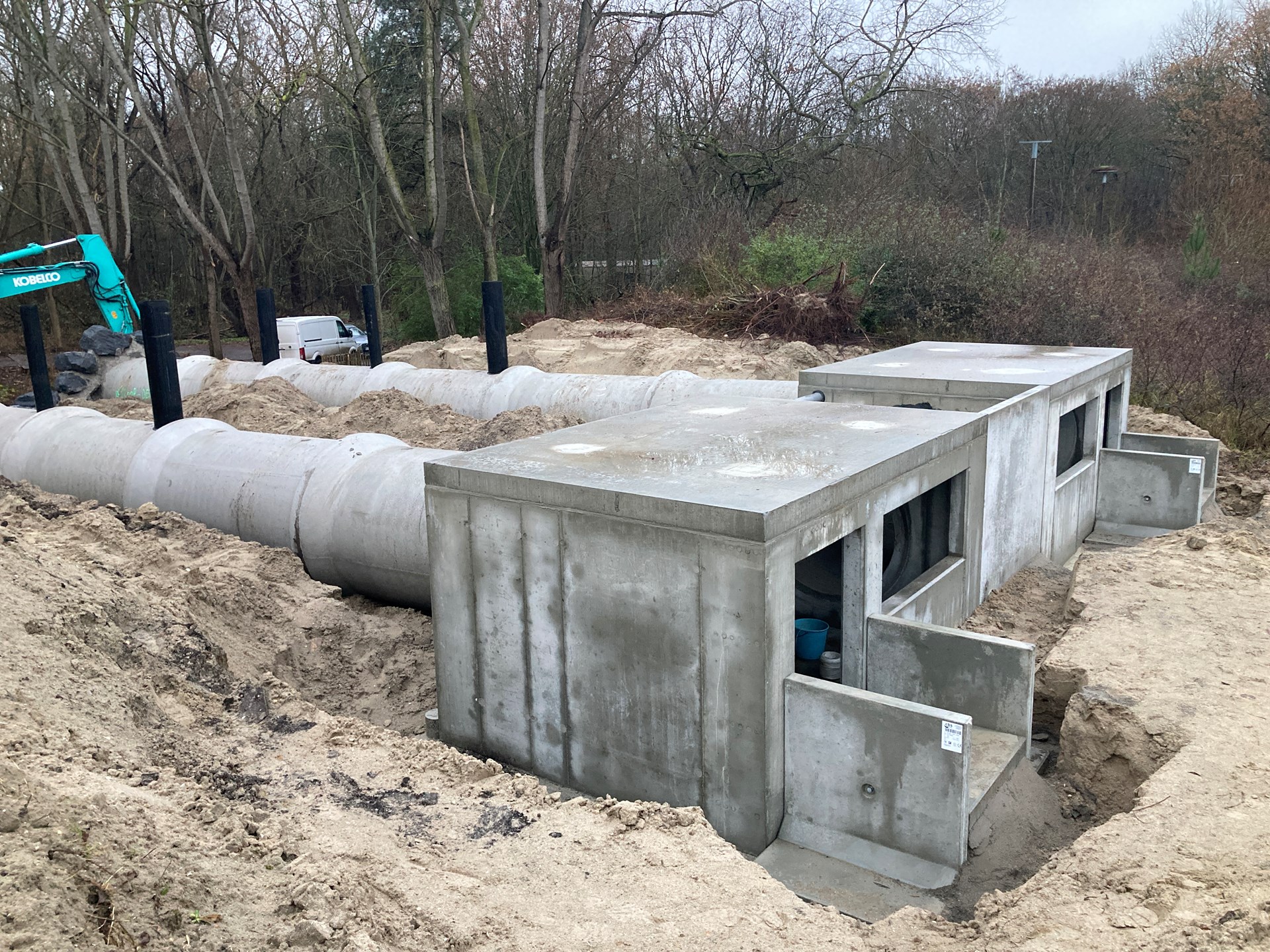 Prefab beton bleek in alle opzichten de ideale oplossing. De volledige ruwbouw werd opgetrokken met standaard betonproducten, waaronder buizen, trappen en op maat gemaakte kelders waarin vooraf alle openingen werden voorzien. Kleine vrachtwagens brachten alle materialen ter plaatse en een graafkraan plaatste ze. Omdat alle onderdelen kant-en-klaar werden aangeleverd, kon de hele constructie op enkele dagen tijd gemonteerd worden zonder dat er een storende betonpomp aan te pas kwam.