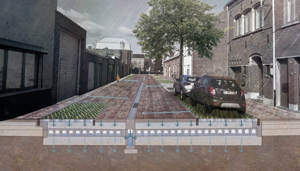 Vanwege de beperkte ruimte in de Nonnenstraat zocht Aquafin naar een ondergrondse oplossing. Een innovatief systeem met Fluvioblok-blokken werd ontwikkeld in samenwerking met het studiebureau Gowaco. Deze holle betonelementen kunnen onder de weg worden geplaatst, waar ze grote hoeveelheden water opslaan en laten infiltreren. Zo vergroot de buffercapaciteit aanzienlijk en kan het regenwater beter in de grond zakken.