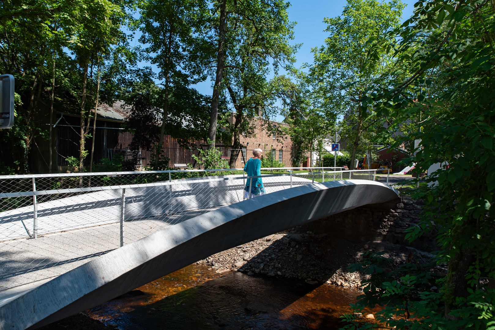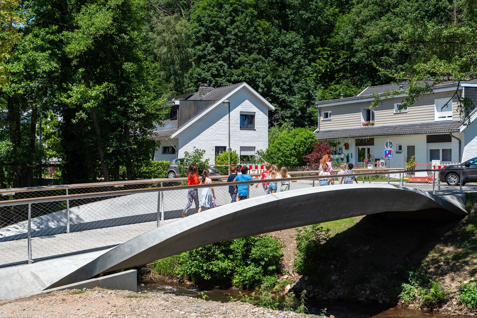 De jury van de FEBE Elements Awards 24 was zeer onder de indruk van het ontwerp van de vier voetgangersbruggen, gebouwd in het kader van de heropbouw van zeven bruggen over de Vesder na de overstromingen van juli 2021: “Een unieke vorm werd ontwikkeld om overspanningen van 17,5 m, 21,5 m en 25,5 m te realiseren, met twee platte bogen die de waterdoorstroming optimaliseren.”