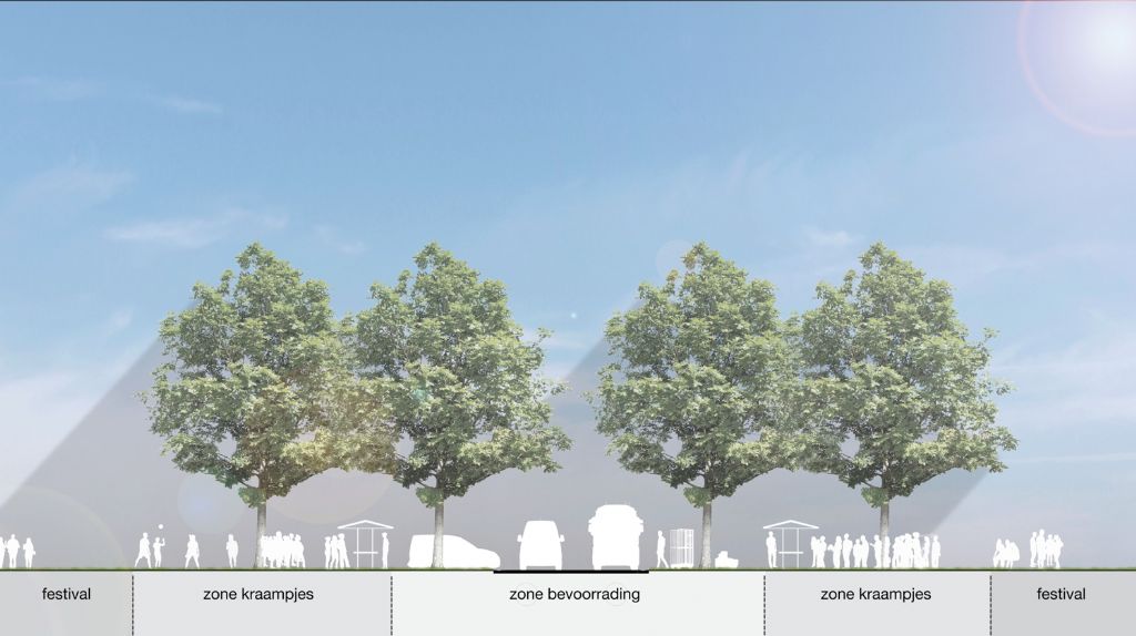 Tijdens het festival wordt het park als het ware “binnenstebuiten” gekeerd. De drie- en vierdubbele dreven die het landschapspark ontsluiten vormen het landschappelijke raamwerk voor de inplanting van de kraampjes. De achterkanten van deze kraampjes grenzen aan de verharde fiets- en wandelpaden en functioneren tijdens het festival als dienstweg. De totale breedte van deze verharde paden laat toe om twee vrachtwagens of dienstvoertuigen te laten kruisen. De dreven markeren de grens tussen de festivalweide en de rondgangzone en bieden tegelijkertijd schaduw aan de kraampjes. Ter hoogte van de rustweide wordt een walnoten boomgaard voorzien die bijkomend schaduw aan de ligweide biedt.