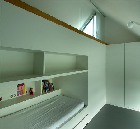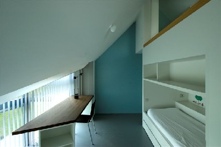 De kamer bevindt zich in een sober rechthoekig woonhuis met een zadeldak. Dit maakt dat er sprake is van een soort wigvorm. Supply en Lahtua hebben ook daar hun creativiteit laten spreken. Waar er in de ene kamer op die manier een lange, zwak schuin oplopende lichtband ontstaat, valt het licht in de andere kamer binnen door een verticaal raam. Dit resulteert in diverse doorzichten vanop verschillende kijkhoogten. De kamers kunnen verduisterd worden met behulp van een rolgordijn met automatische bediening.